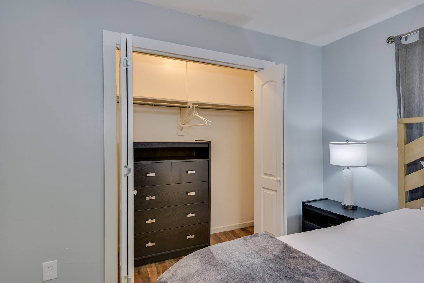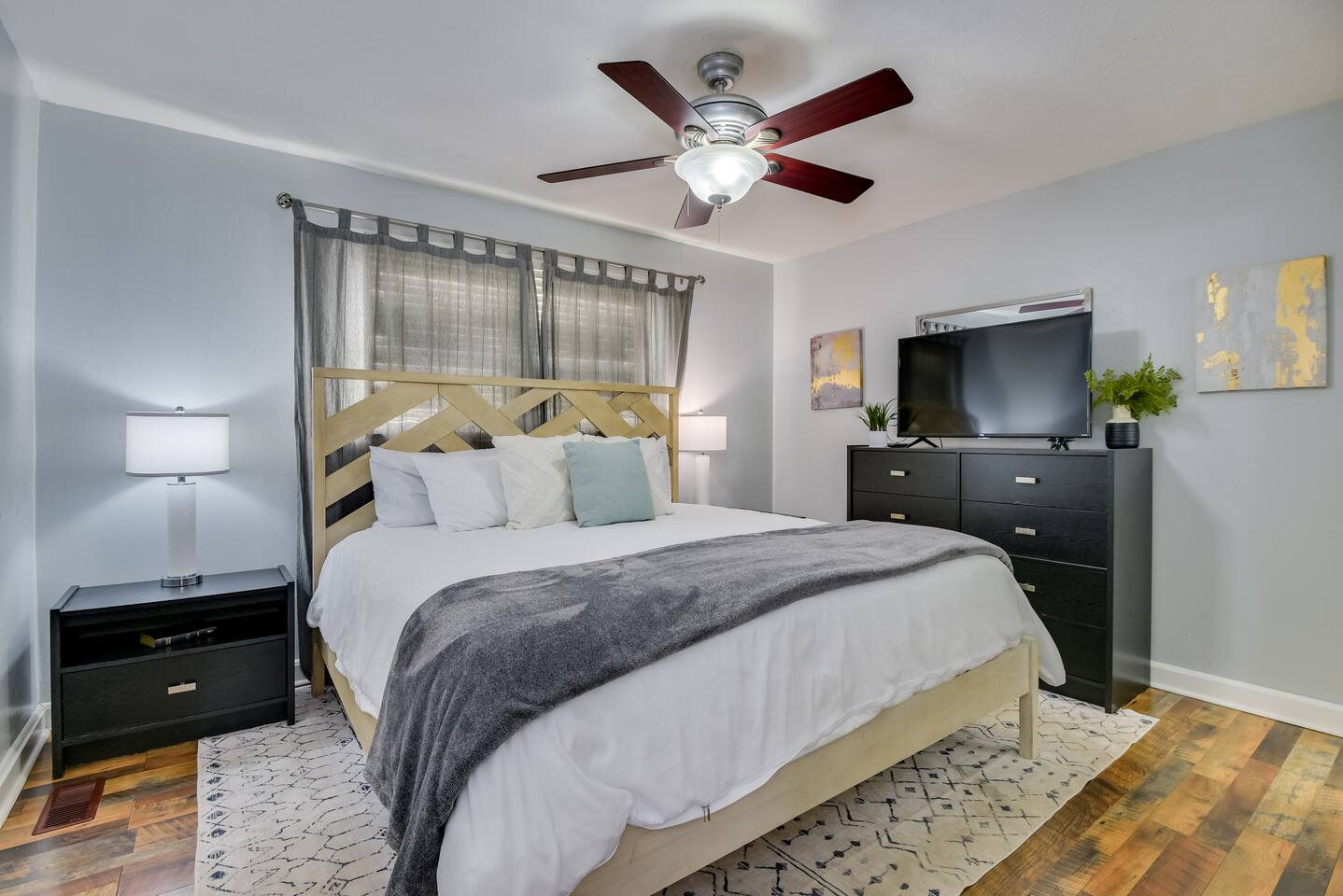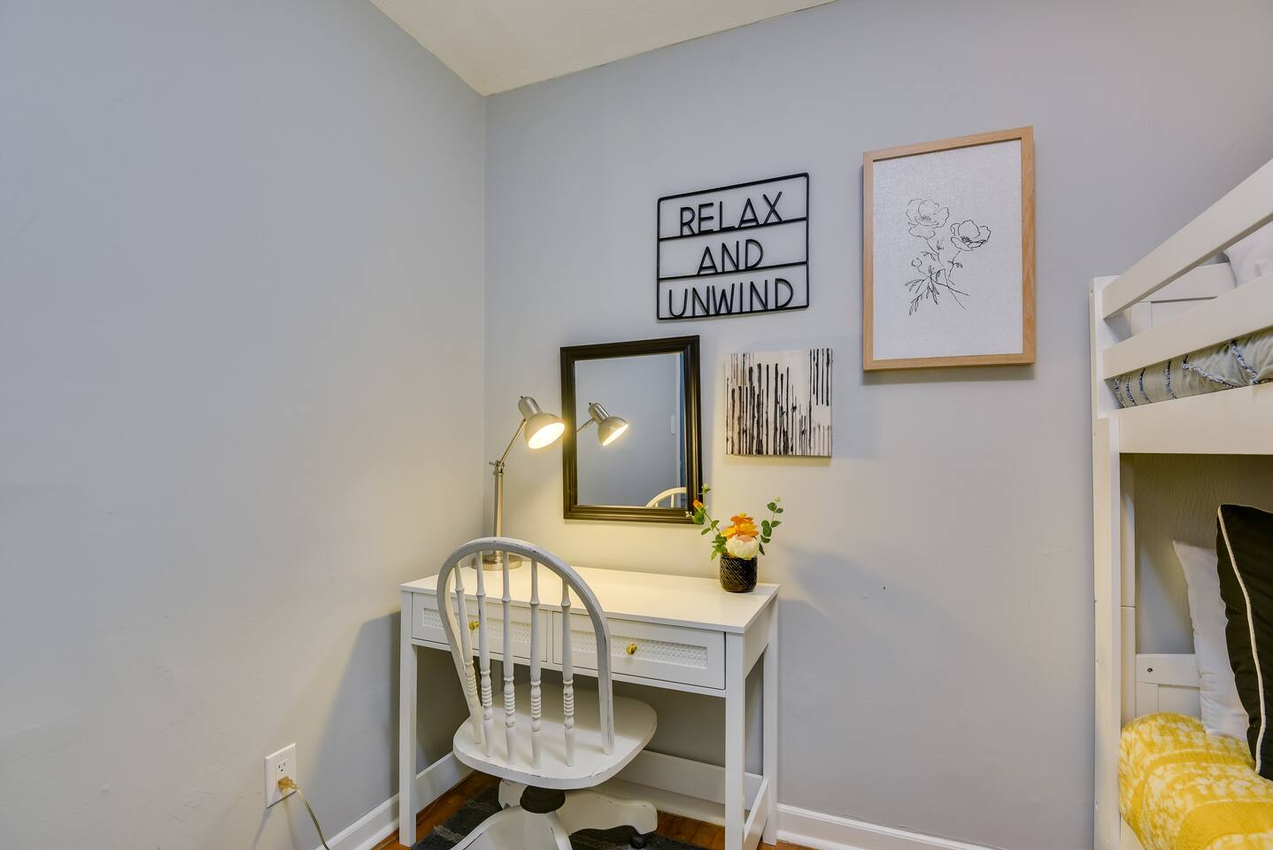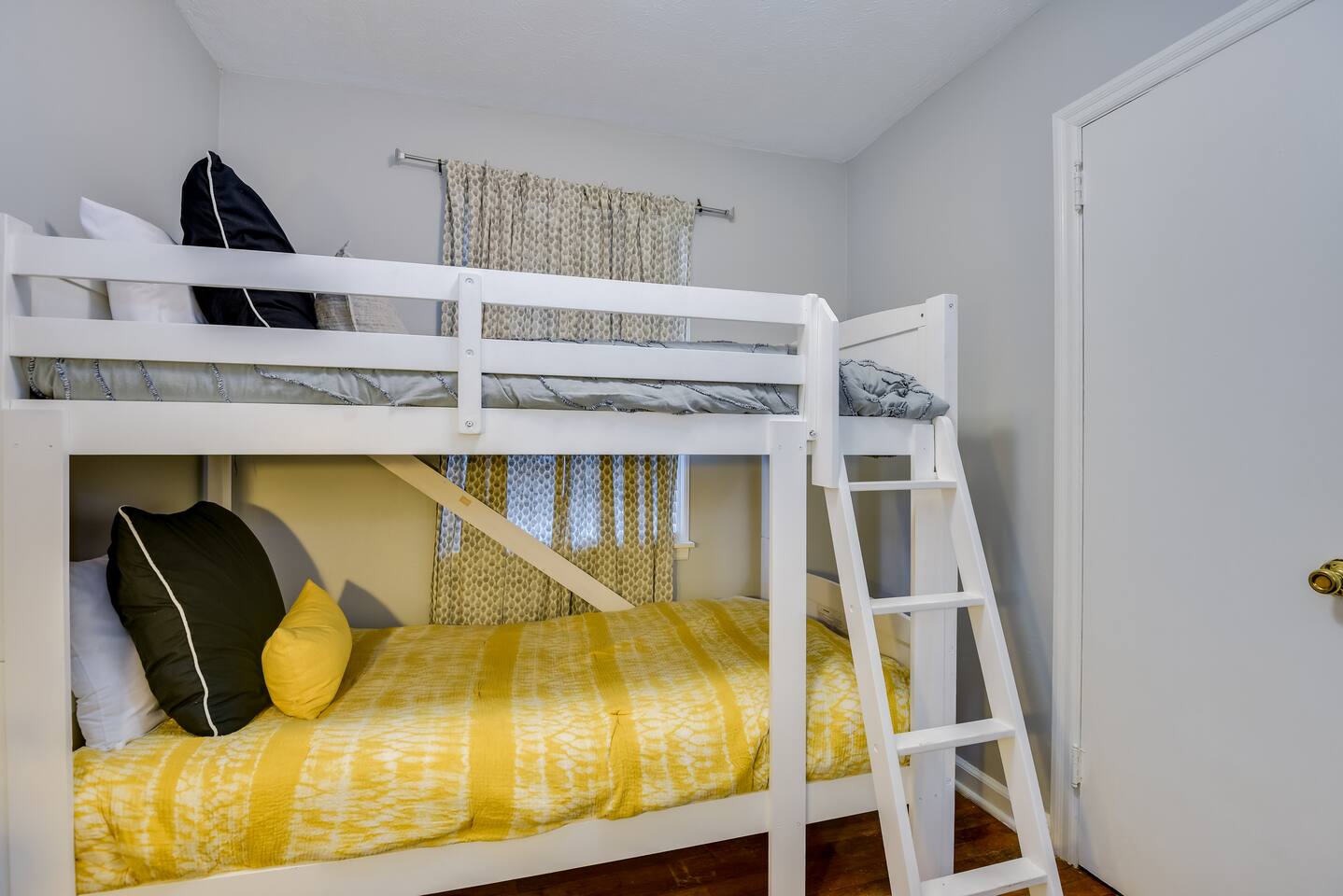 Inside: 🏠 -Bedroom 1: Master suite with king bed, nightstand, dresser, closet, TV, ensuite bathroom -Bedroom 2: Queen bed with night stand, dresser, closet -Bedroom 3: Queen bed with night stand, dresser, closet -Bedroom 4: Bunk bed (two twin beds), closet, desk w/ chair -Full Bathroom 1: Inside master suite, tub/shower combo -Full Bathroom 2: Located in hall near bedrooms, walk in shower -Kitchen: Stainless steel appliances and fully stocked with gas stove/oven, fridge/freezer, microwave and breakfast table seats 3 -Dining room: Large table seats 8 -Living room: Sectional sofa, 2 chairs, TV -Laundry room: Full size washer and dryer Outside: 🌳 -Deck with patio table seats 4, gas grill -Free parking in the driveway up to 3 vehicles Things you'll love ❤️ -Coffee station with coffee pot and Keurig -Inviting and colorful interior design -Outdoor hot tub (open seasonally from Nov-Feb only)