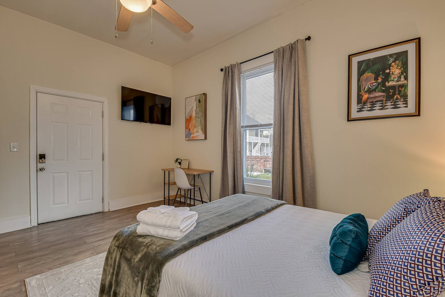 8 min/4.9 mi to the Augusta National/Masters Tournament! Welcome to this cozy studio apartment, designed for comfort and convenience. Unwind in the queen-sized bed with freshly washed linens and soft pillows, while blackout curtains ensure a restful night’s sleep. The space features high ceilings, giving it an open and airy feel. A mounted flat-screen TV lets you relax with your favorite shows, and the dedicated workspace with a desk and chair is perfect for remote work or planning your day. The fully stocked kitchenette includes a 2-burner stovetop, toaster oven, and all the essentials for easy meal prep. On-site shared laundry makes longer stays a breeze, and the back porch seating offers a great spot to enjoy your morning coffee or unwind in the evening. Please note: This property has a total of five rental units within the building.