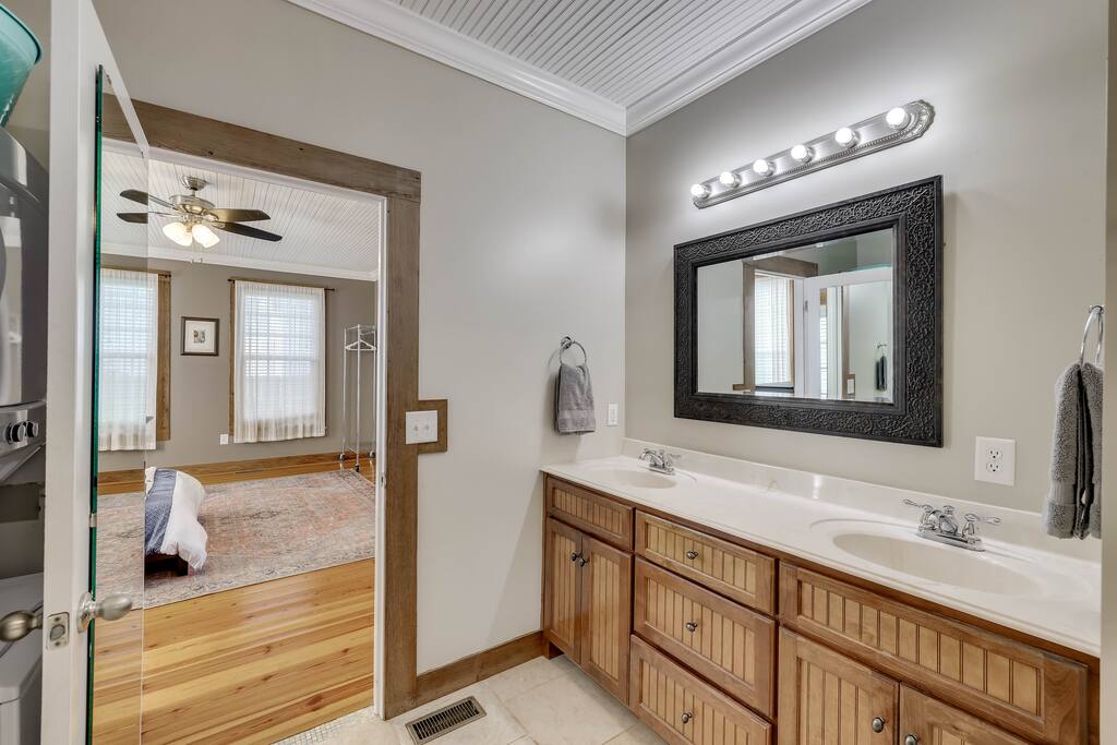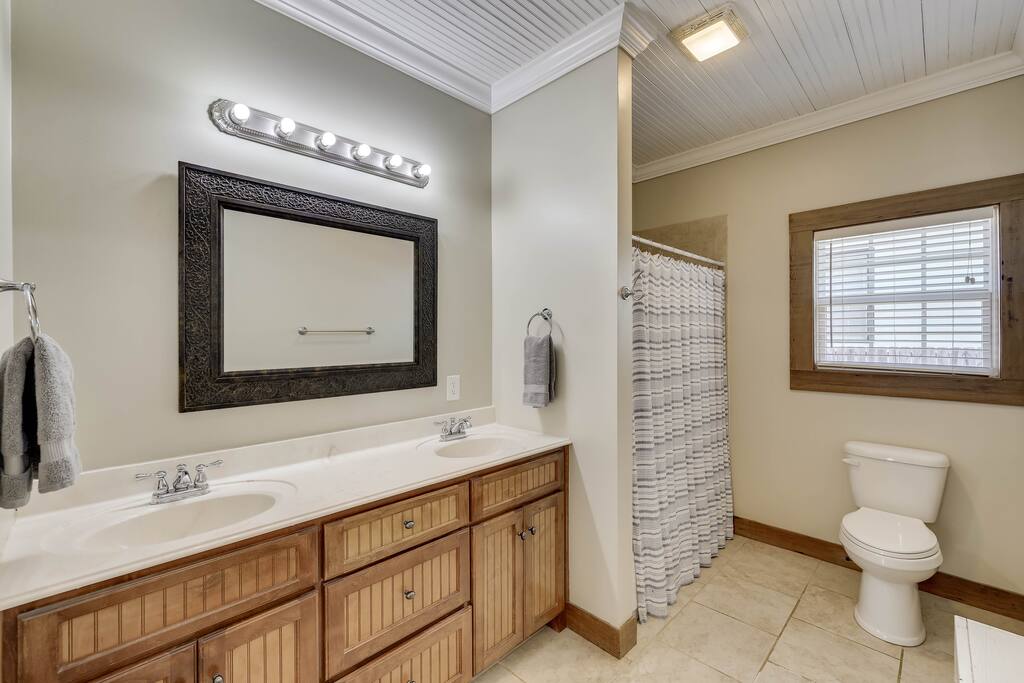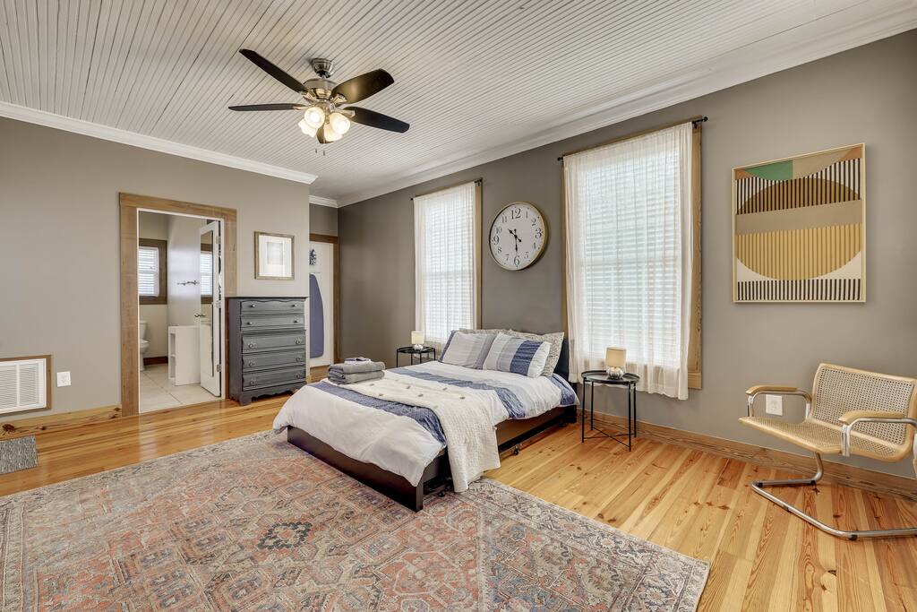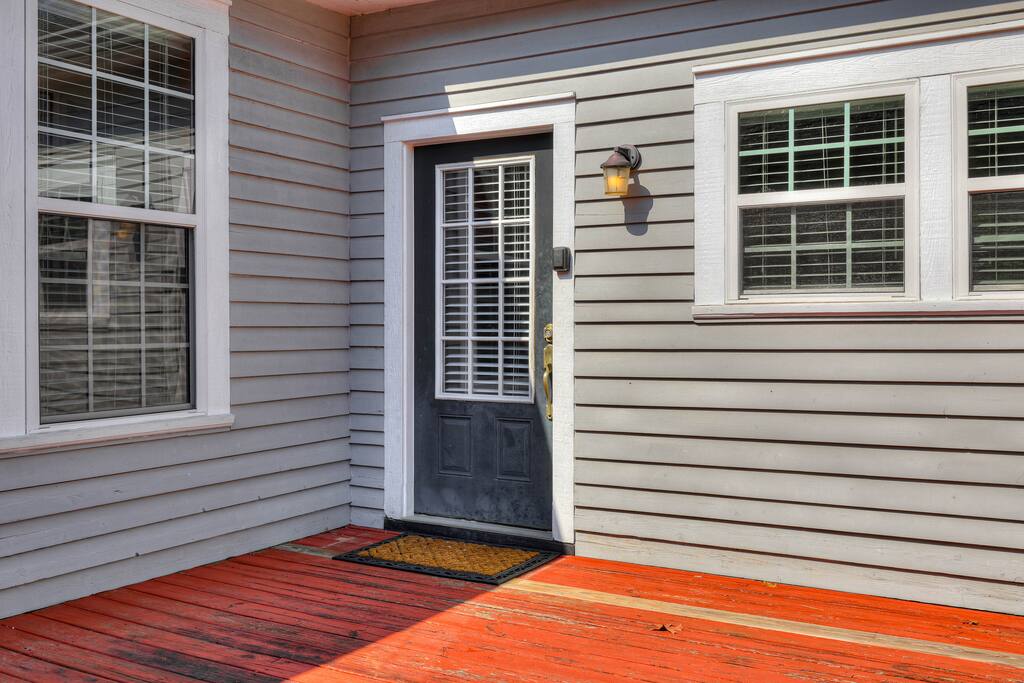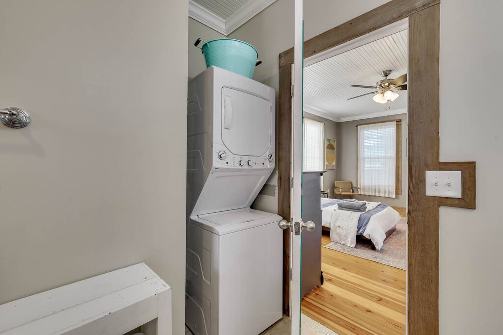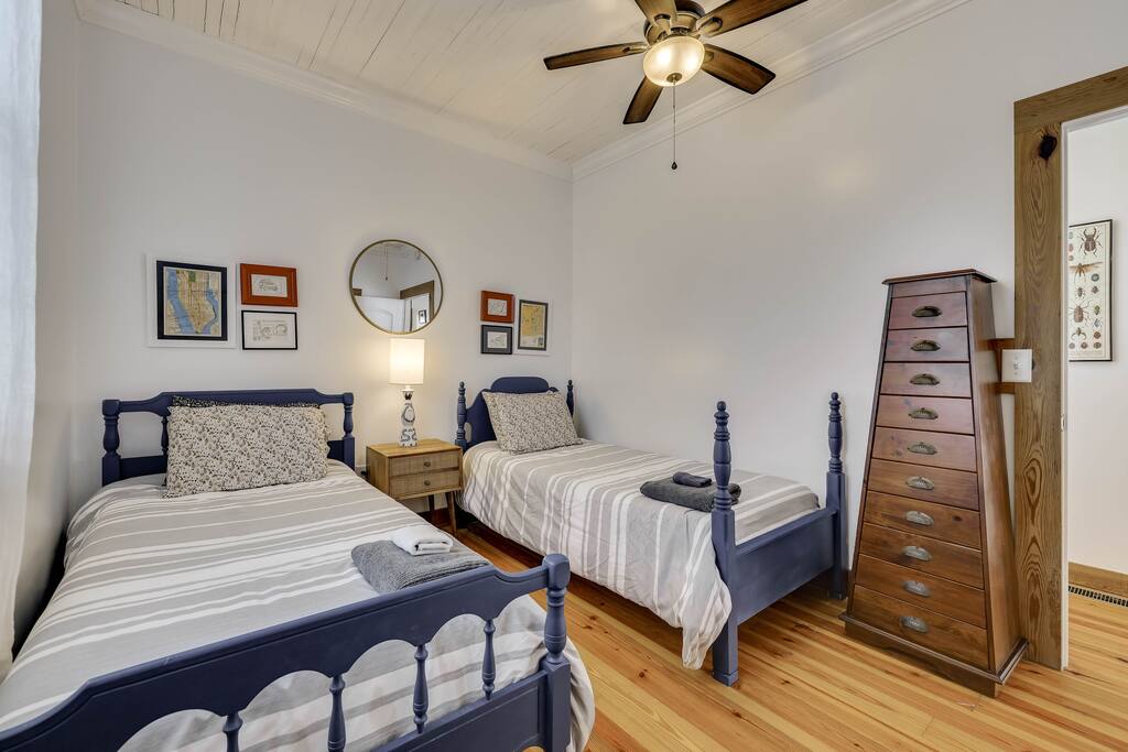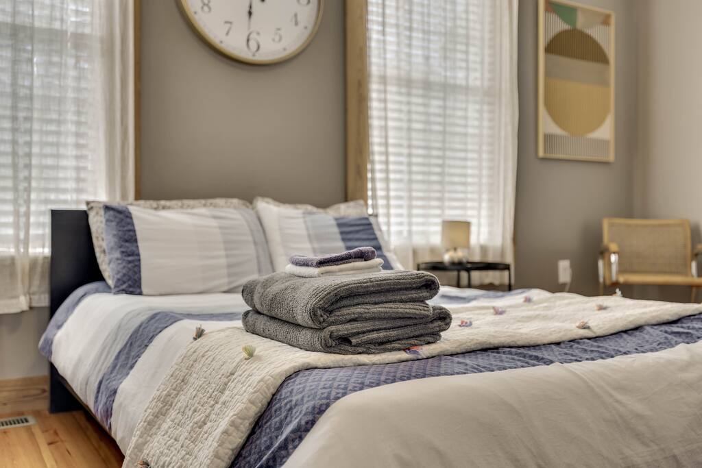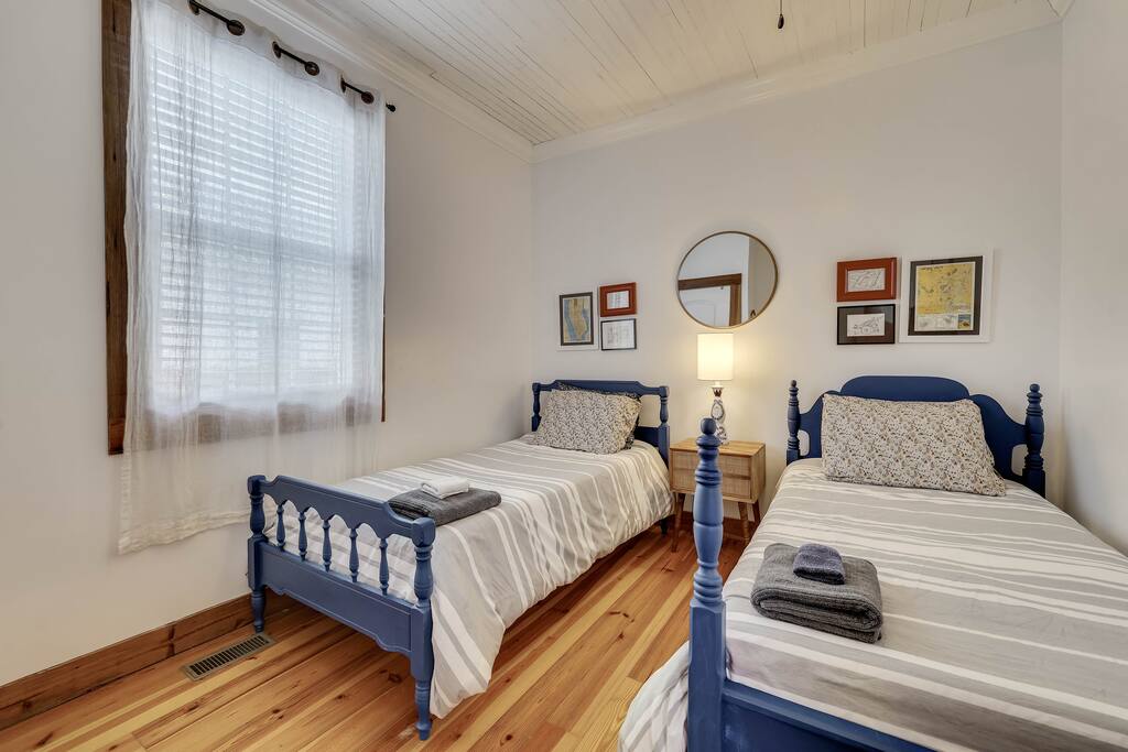 Horseshoe Cottage offers a cozy home and walkable distances for entertainment :) Indoors - single story home with the entrance sitting on the deck that has a few small steps to get up Bedroom 1: Large and spacious with a full bed and attached bathroom Bedroom 2: Two twin beds next to a full bathroom Bathroom 1: Attached to master bedroom, has a tub and stacked washer and dryer Bathroom 2: Attaches to both Bedroom 2 and the hallway Fully equipped kitchen: - dining table gets plenty of natural light throughout the day - Plenty of cooking utensils and dishes so you can enjoy your stay fully Dining area: Seats 4 Living room: -cozy sitting area -smart tv right off the covered front porch overlooking York street Outdoors: Large Driveway for up to 6 vehicles Large back yard for pets to run around in, please note that the property is not fully fenced in