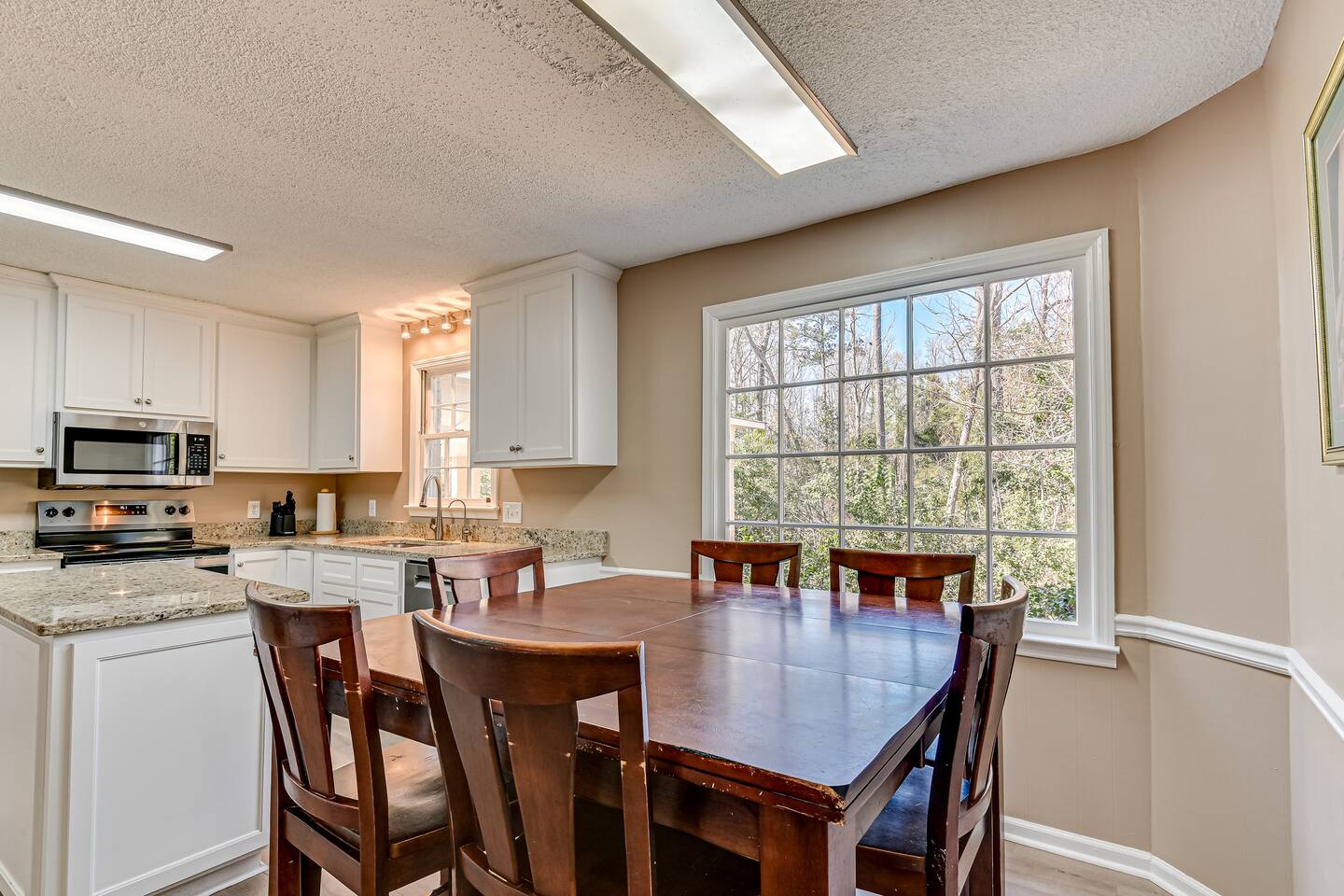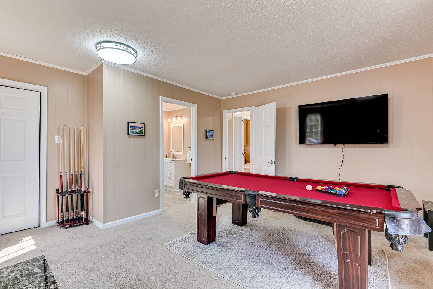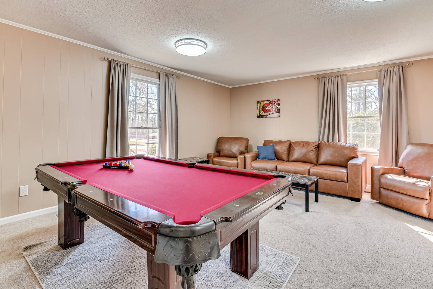 Hosted by Augusta's local STR experts - Garden City Hosts, LLC 🌷 Inside: 🏠 Downstairs -Kitchen: Stainless steel appliances and fully stocked with electric stove/oven, fridge/freezer, microwave, coffee pot, and breakfast table seats 6 Dining Room: Seats 6 -Laundry room: Full size washer and dryer -Living room 1: Sectional Sofa, TV -Living room 2: Sectional Sofa -Living room 3: Queen pullout sofa, 2 chairs, TV, Pool Table! -Office: Built in desk and chair -Full bathroom -Half bathroom Upstairs -Bedroom 1: Master suite with king bed, night stand, dresser, closet, ensuite bathroom with walk in shower -Bedroom 2: King bed, night stand, dresser, closet -Bedroom 3: Queen bed, night stand, dresser, closet -Bedroom 4: Queen bed, night stand, dresser, closet -Full Bathroom: Located in hall near bedrooms, tub/shower combo Outside: 🌳 -Carport -Free parking in the driveway