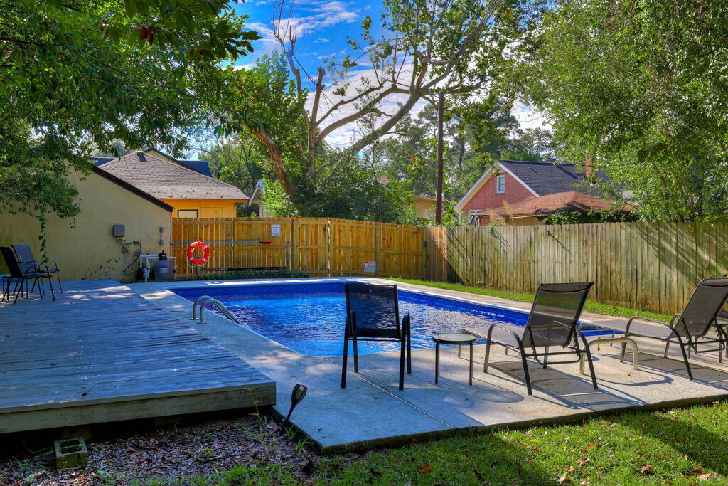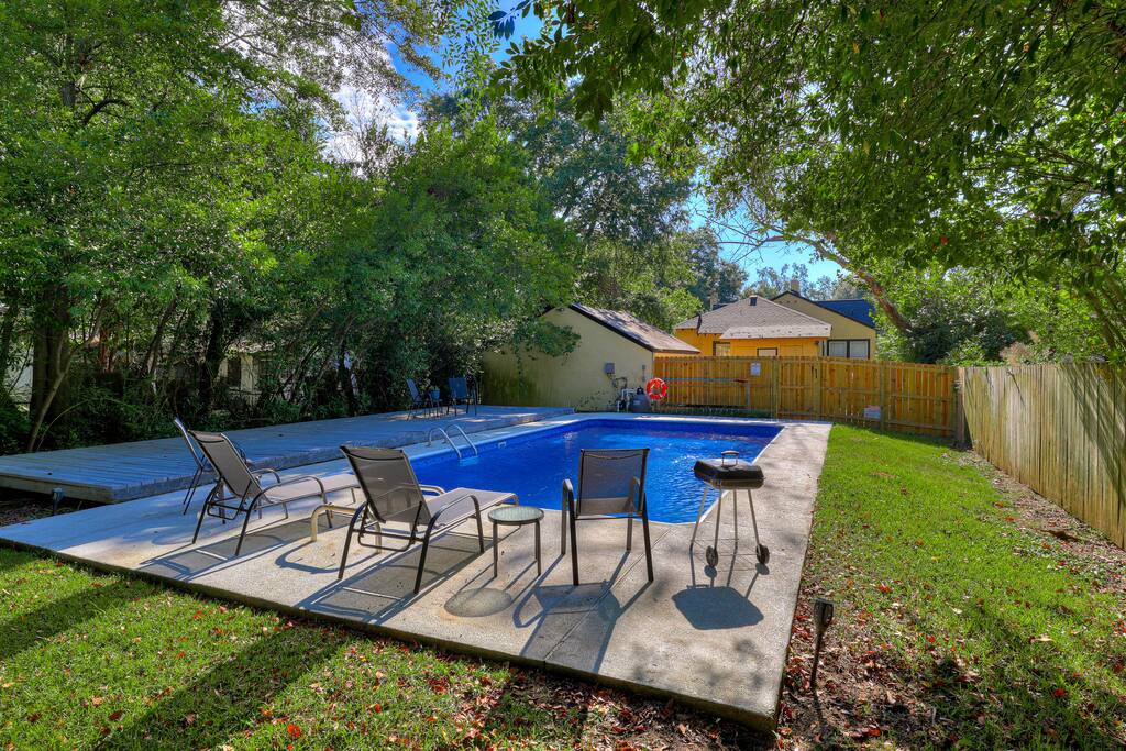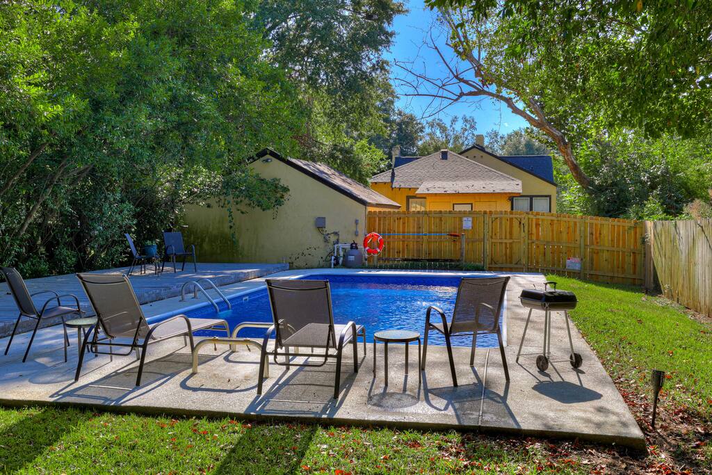The bungalow is a completely private home, centrally located in the heart of Augusta. Inside of the historic space, you'll find everything you need for an exceptional guest experience. Cozy living room w/ smart TV. Fully- stocked kitchen for prepping meals. Clean, comfortable bedrooms w/ memory-foam mattresses, luxury linens, & window coverings. Twin rollaway bed for an additional guest. Bathrooms with rainfall showerheads (organic bath products & plush cotton towels provided!). Full-sized washer/dryer & laundry supplies. AMENITIES YOU'LL LOVE: - Over 1700 sf of historical living space w/ covered front porch - Living room with Fire TV - 3 Bedrooms: Each w/ memory foam matresses, luxury linens, privacy window blinds, and closet storage - Twin-sized rollaway bed w/ linens to sleep an additional guest - Plenty of closet space w/ hangers & luggage storage - 2 bathrooms: (1) Vintage-designed bathroom with tub/shower combo, rainfall shower head & organic bath products, (1) En-suite 3/4 bathroom with waterfall shower head & organic bath products - Full kitchen: fridge w/ icemaker & filtered water, gas stove, microwave, dishwaher, toaster, Keurig cappuccino machine, tea kettle, various Tazo teas & coffee pods, all kitchen basics you'll need to make & enjoy a meal - Dining room with farmhouse table that seats 6 - Washer/dryer & laundry supplies for use during your stay - Air-conditioning + ceiling fans - USB Ports & outlets - Verizon high-speed Wi-Fi - Off-street parking - Easy check-in with coded keypad lock -Large private pool in the backyard. Take a swim in the large private pool in the backyard! Note: the pool will be closed for the season starting Oct 21 2025.