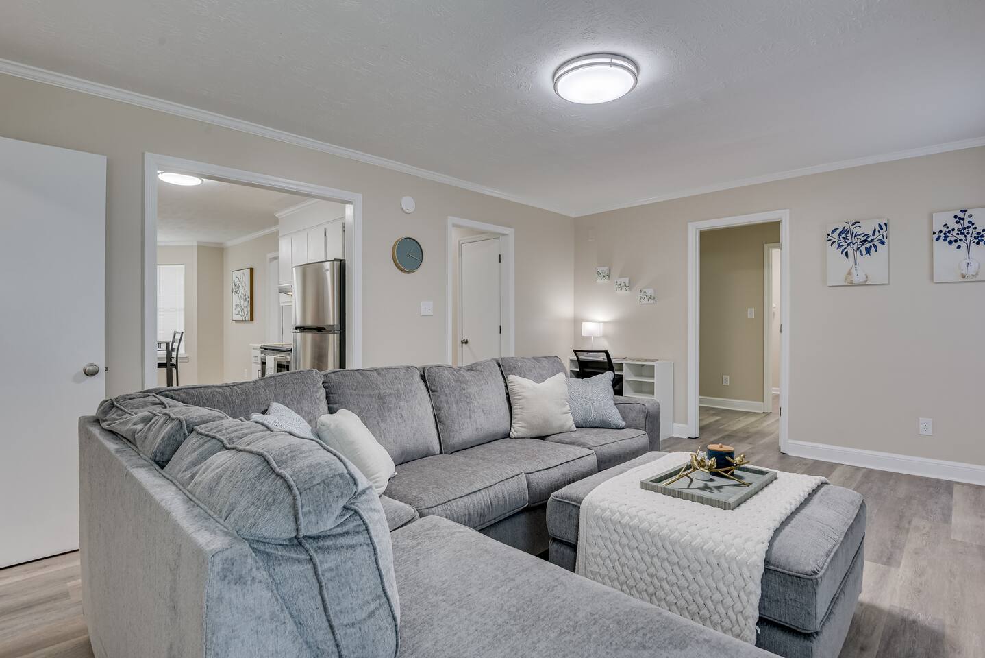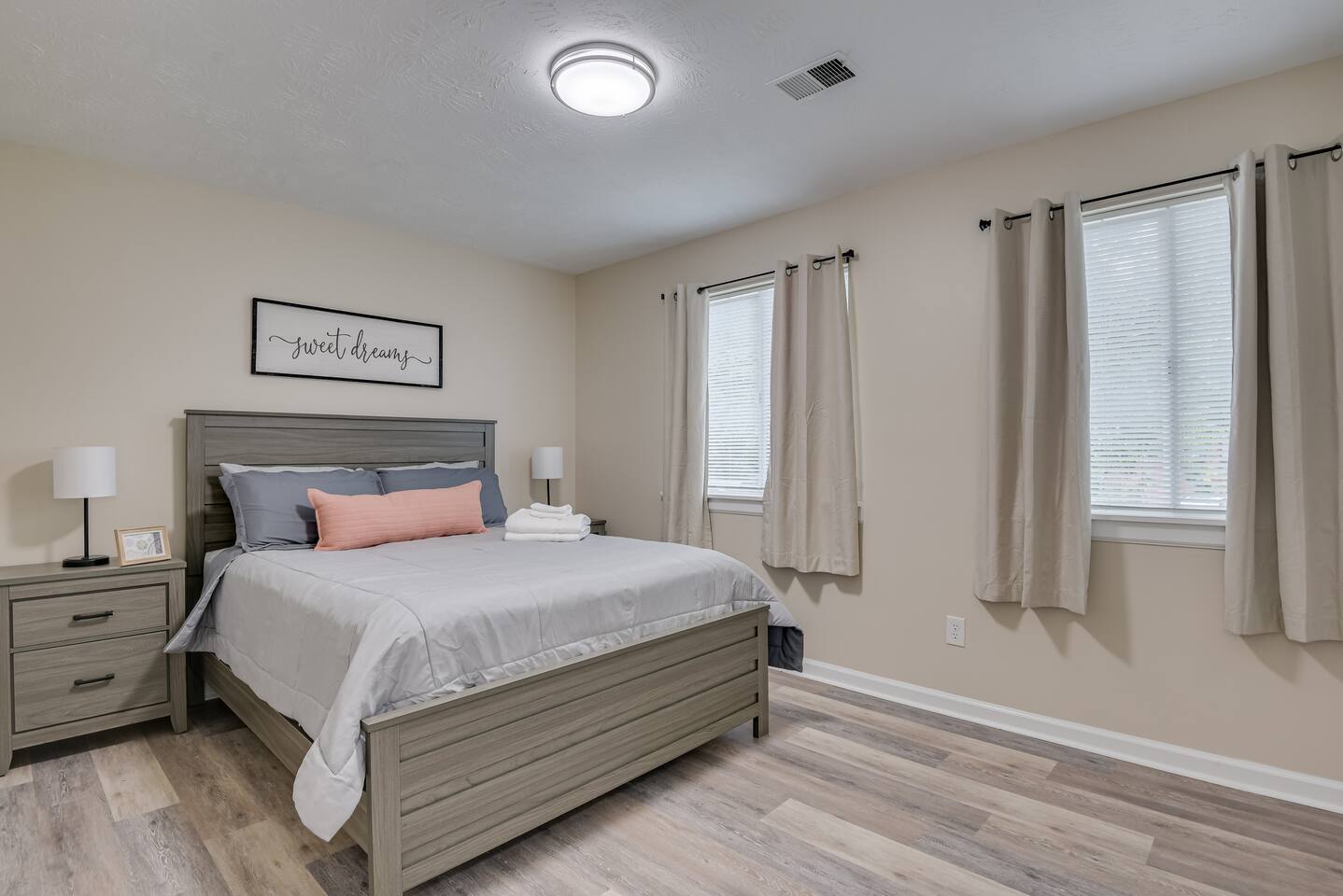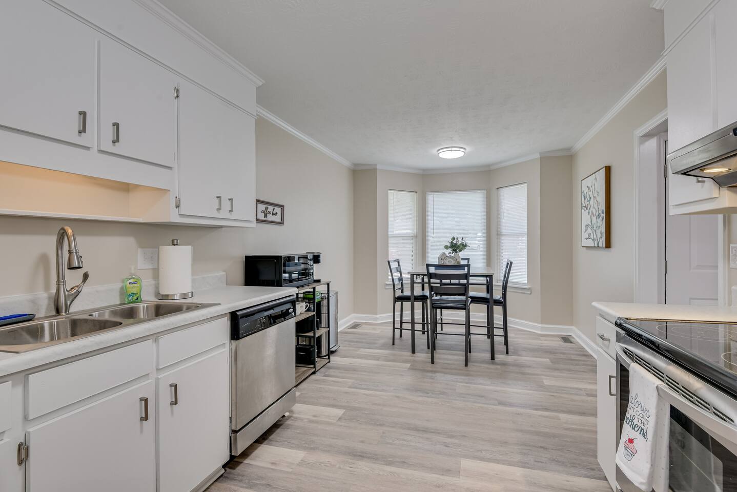 Downstairs: Bedroom 1: Master suite with king bed, dresser, closet, TV, ensuite bathroom with tub/shower combo Living room: Sectional pullout sofa, TV, desk w/chair Kitchen: Stainless steel appliances and fully stocked with electric stove/oven, fridge/freezer, microwave, breakfast table seats 4, and coffee station with Keurig Laundry room: Full size washer and dryer Upstairs: Bedroom 2: Queen bed with 2 night stands, closet Bedroom 3: Two twin beds with night stand, closet Full Bathroom: Located in hall near bedrooms, tub/shower combo Outside: Deck with patio table seats 4, patio umbrella and fully fenced in back yard. Free parking in the driveway