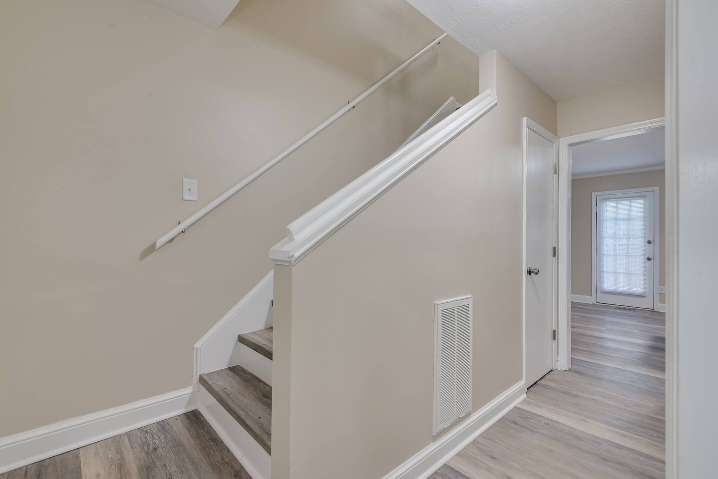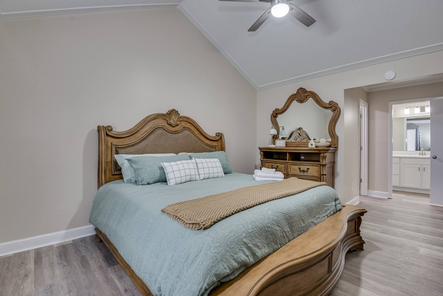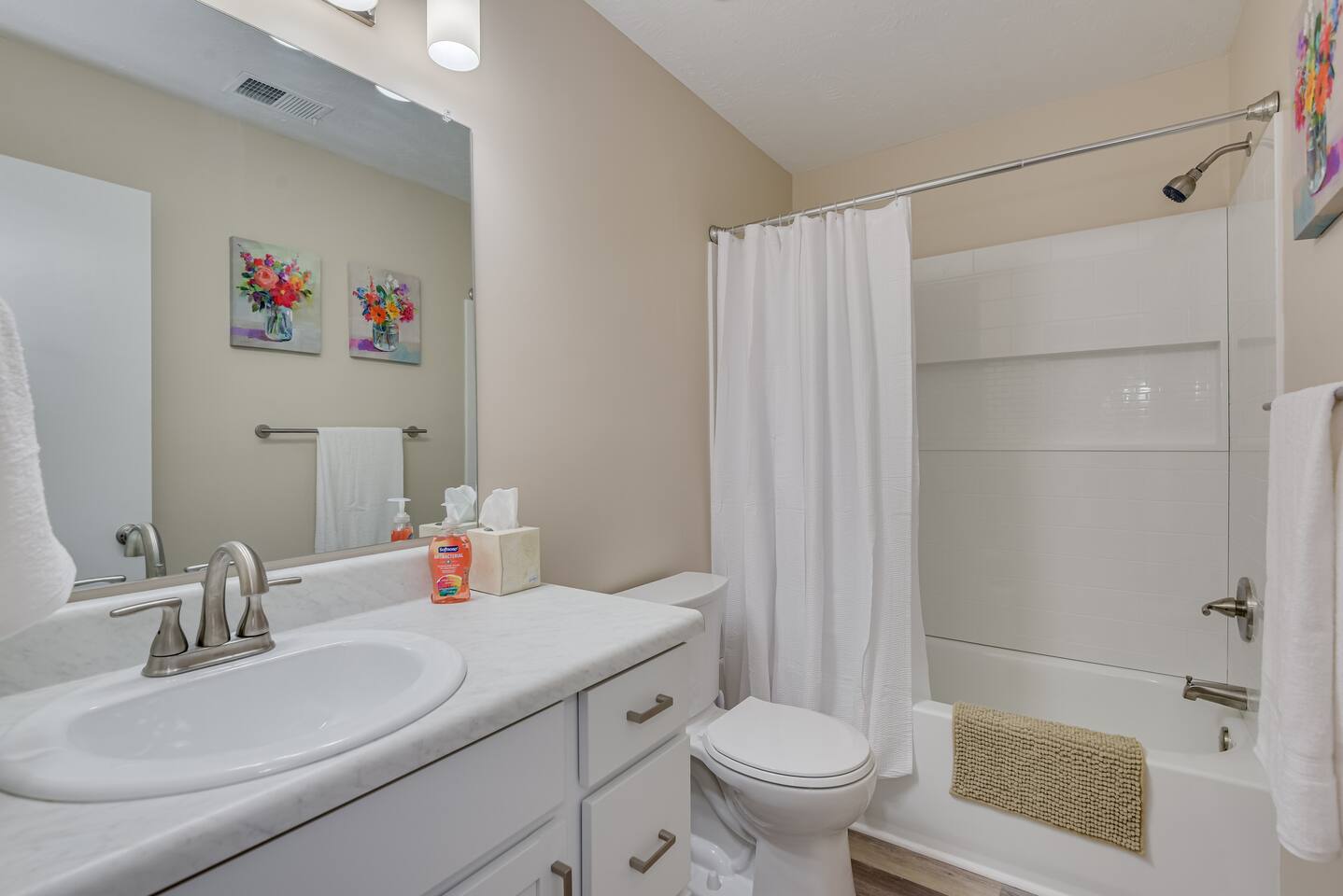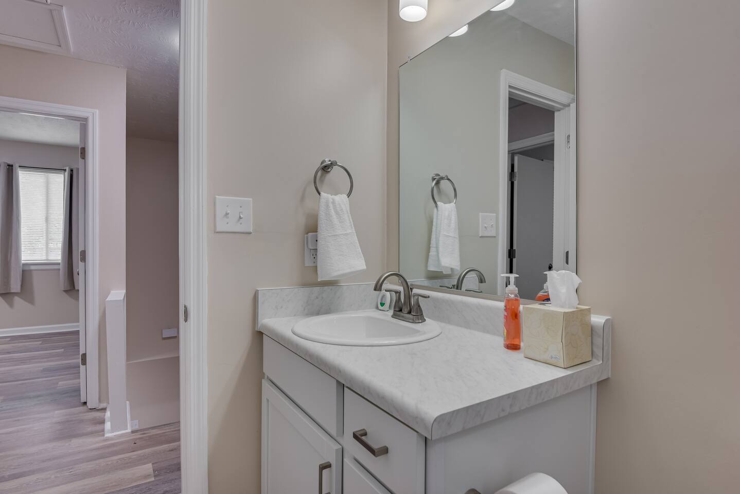Downstairs: Bedroom 1: Master suite with king bed, dresser, closet, TV, ensuite bathroom with tub/shower combo Living room: Sectional pullout sofa, TV, desk w/chair Kitchen: Stainless steel appliances and fully stocked with electric stove/oven, fridge/freezer, microwave, breakfast table seats 4, and coffee station with Keurig Laundry room: Full size washer and dryer Upstairs: Bedroom 2: Queen bed with 2 night stands, closet Bedroom 3: Two twin beds with night stand, closet Full Bathroom: Located in hall near bedrooms, tub/shower combo Outside: Deck with patio table seats 4, patio umbrella and fully fenced in back yard. Free parking in the driveway