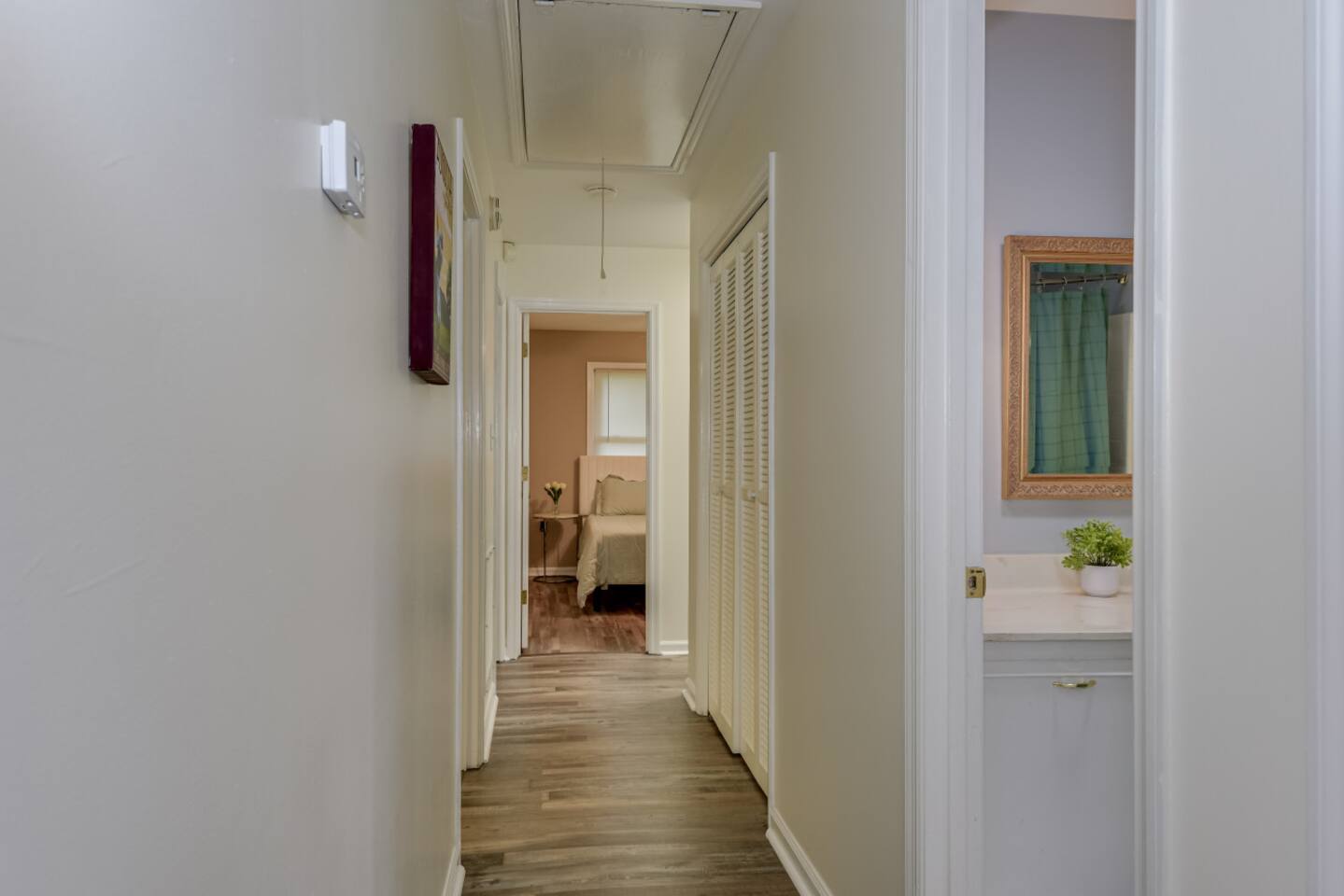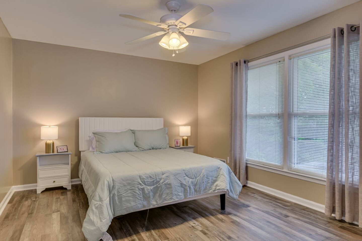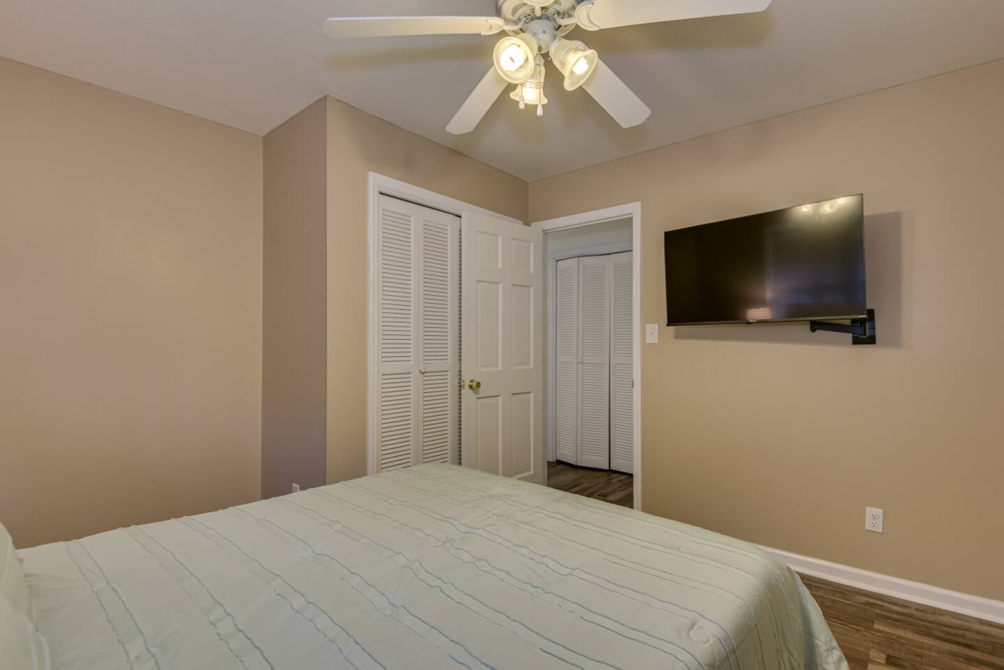 All one level home with 2 entrances (front door and rear entrance under carport). Bedroom 1: Queen bed, closet, large screen TV, ensuite bathroom Bedroom 2: Queen bed, closet, large screen TV Bedroom 3: Queen bed, closet, large screen TV Bedroom 4: Two full size beds, large screen TV Living room 1: Sectional seating for 10 and large screen TV Living room 2: Game room with pool table and arcade game Dining room: Table seats 6 Kitchen: Electric stove/oven, ample storage, well stocked, full size fridge, breakfast table seats 4 Sunroom: Workspace with chair, seating for 2, large screen TV Backyard: fenced in with patio, gas grill, table and chairs seats 2