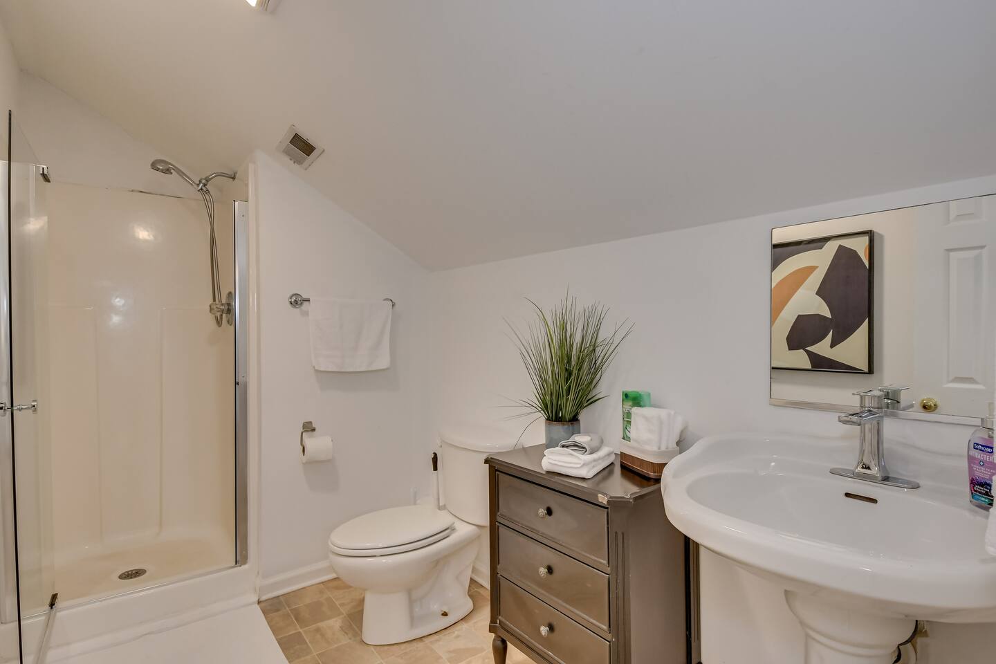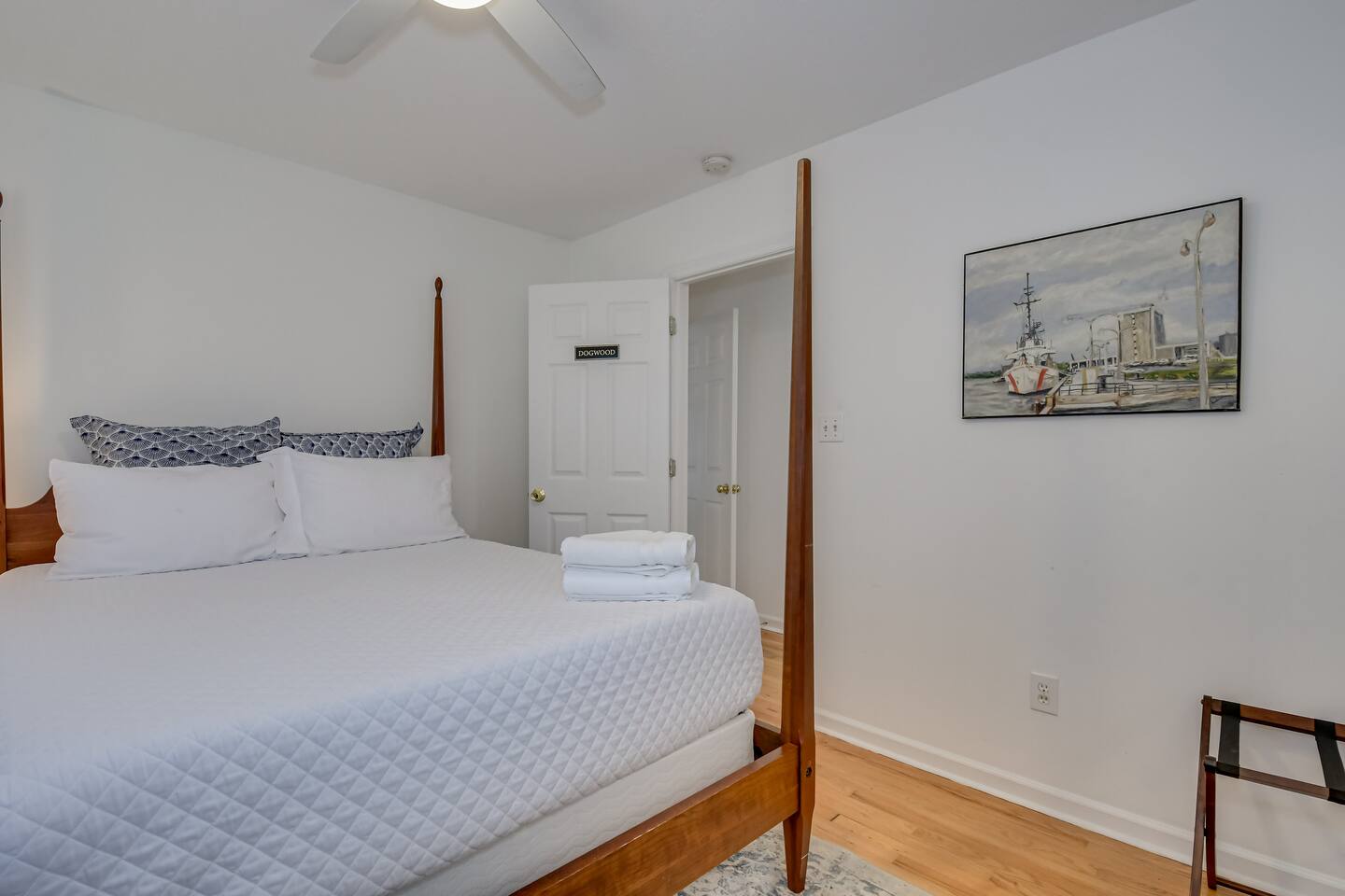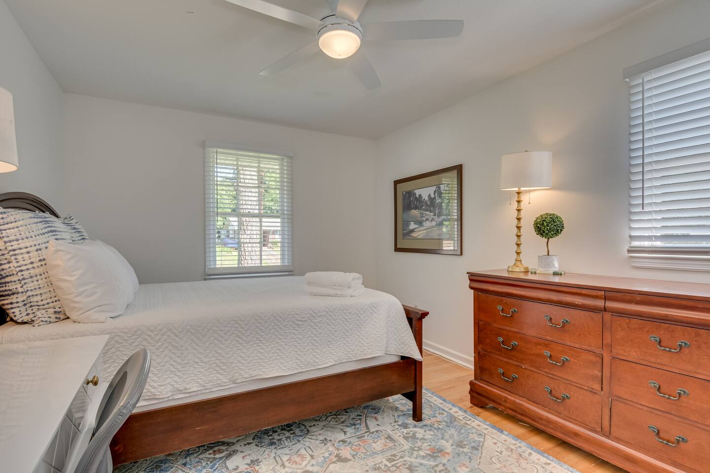 Interior: -Main floor Bedroom 1: Queen bed, ensuite bath, dresser, TV -Main floor Bedroom 2: Queen bed, dresser, desk/chair, (shared hall bath) -Main floor bedroom 3: Queen bed, dresser (shared hall bath) -Upstairs Bedroom 4: Queen and full bed, dresser, ensuite bath, desk/chair -Office space with oversized oak desk -Full size washer and dryer -Sitting room - Loveseat and 2 chairs -Full size kitchen - stocked with cooking essentials -Dining room - seats 8 -Living room - Large TV, sofa, 2 chairs, coffee table Each room has a new memory foam beds, freshly washed white linens, and large closet. There is a small trash can, power cube with usb, and furniture caddy in all the rooms. Exterior: Deck with seating, grill, and outdoor TV! Oversized driveway fits 6 vehicles with additional parking available on the street.