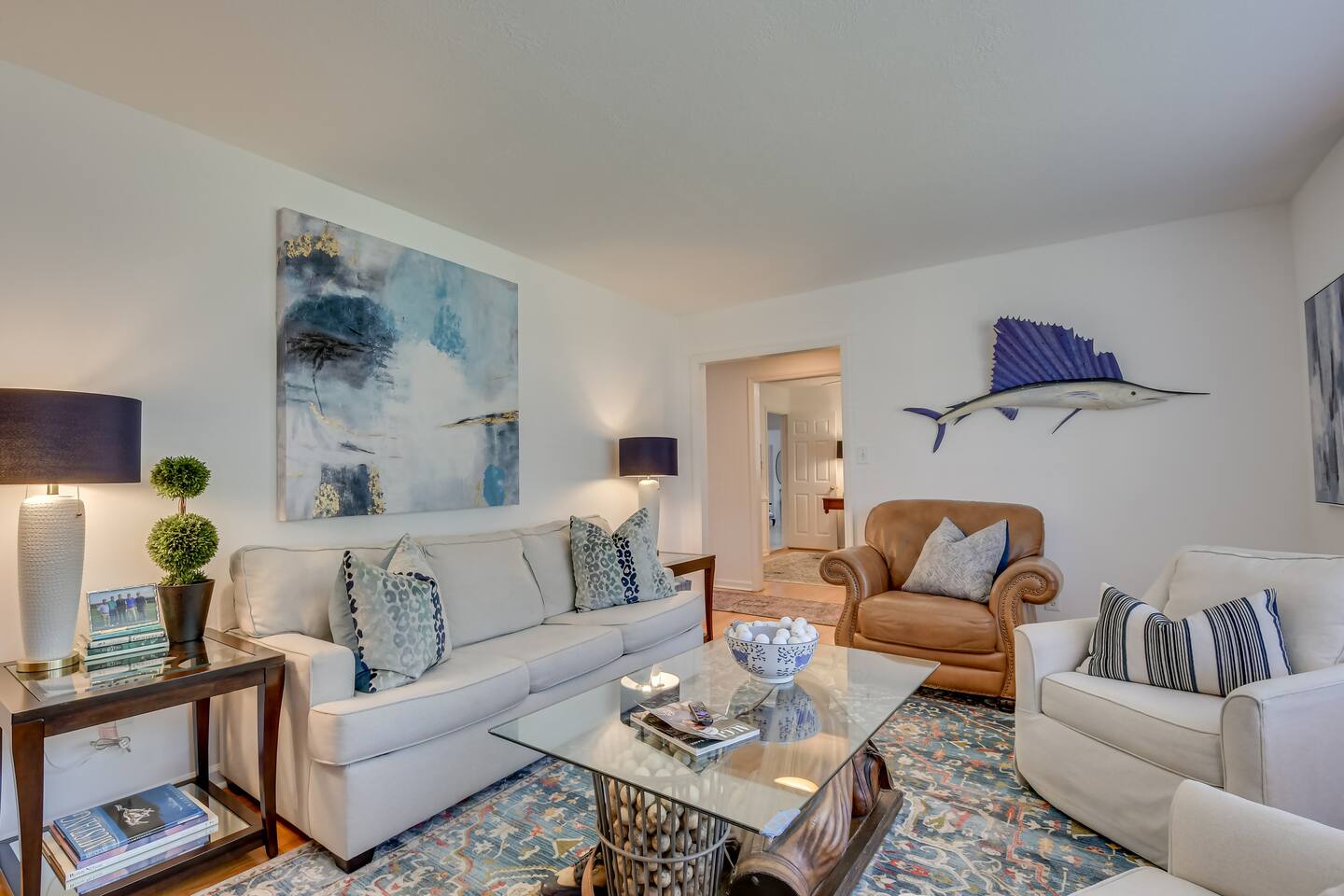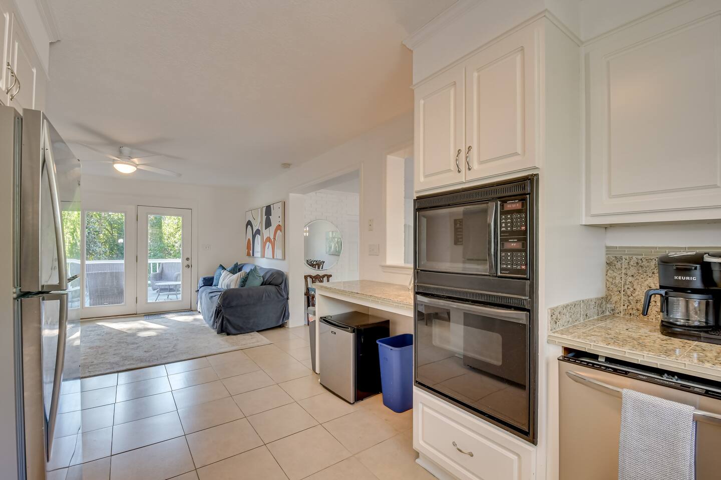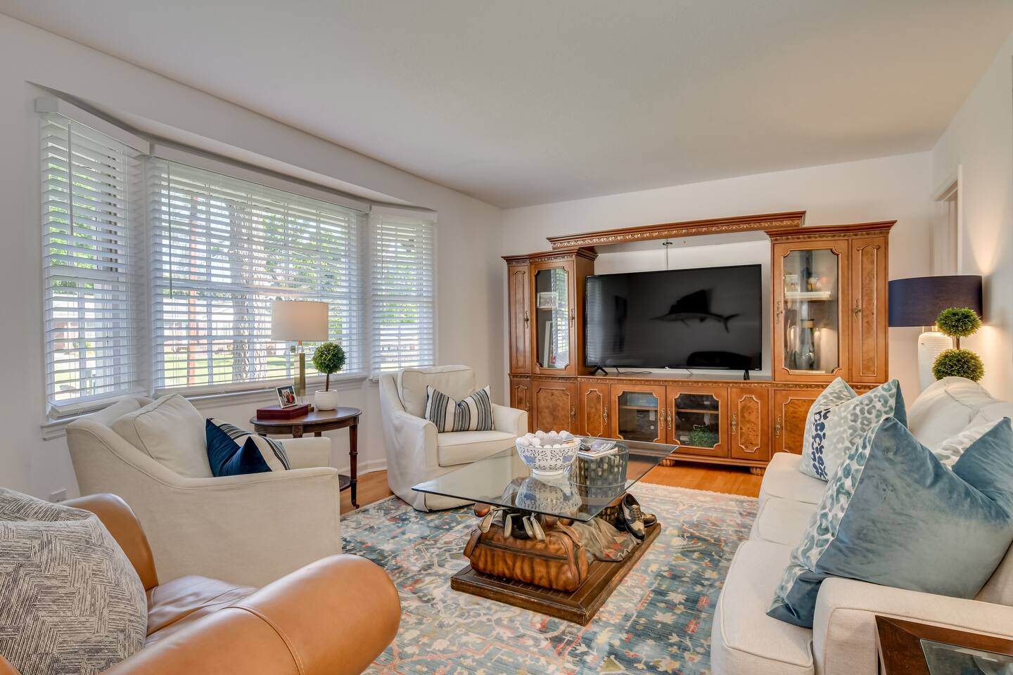 Interior: -Main floor Bedroom 1: Queen bed, ensuite bath, dresser, TV -Main floor Bedroom 2: Queen bed, dresser, desk/chair, (shared hall bath) -Main floor bedroom 3: Queen bed, dresser (shared hall bath) -Upstairs Bedroom 4: Queen and full bed, dresser, ensuite bath, desk/chair -Office space with oversized oak desk -Full size washer and dryer -Sitting room - Loveseat and 2 chairs -Full size kitchen - stocked with cooking essentials -Dining room - seats 8 -Living room - Large TV, sofa, 2 chairs, coffee table Each room has a new memory foam beds, freshly washed white linens, and large closet. There is a small trash can, power cube with usb, and furniture caddy in all the rooms. Exterior: Deck with seating, grill, and outdoor TV! Oversized driveway fits 6 vehicles with additional parking available on the street.