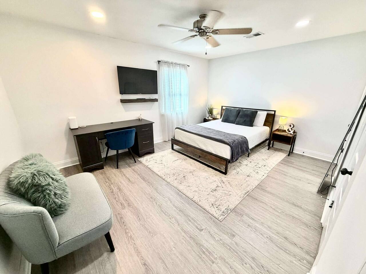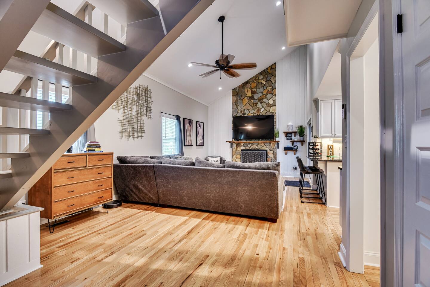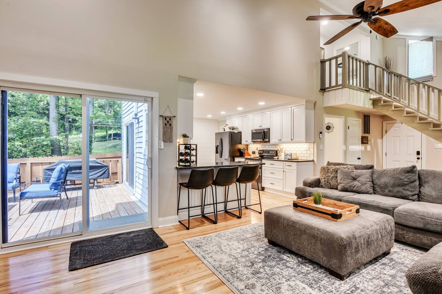Kitchen: Stainless steel appliances, bar counter Dining area: Seating for 4 within kitchen space Living room: 75" flat screen TV and large new sectional Bedroom 1 (Upstairs): Master suite with King bed, dresser, closet, 55" flat screen TV, jack n' jill bathroom that connects to Bedroom 2 Bedroom 2 (Upstairs): Queen bed, desk, chair, closet, 55" flat screen TV, jack n' jill bathroom that connects to Master Bedroom Bedroom 3 (Downstairs): Queen bed, dresser, closet, 55" flat screen TV Deck: Large deck with 2 burner propane gas grill and a 36” propane flat top griddle.