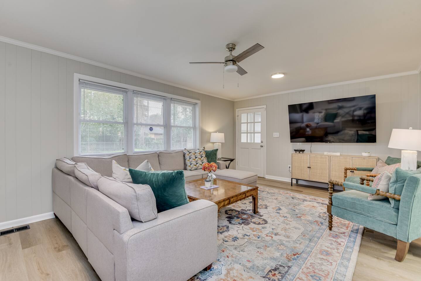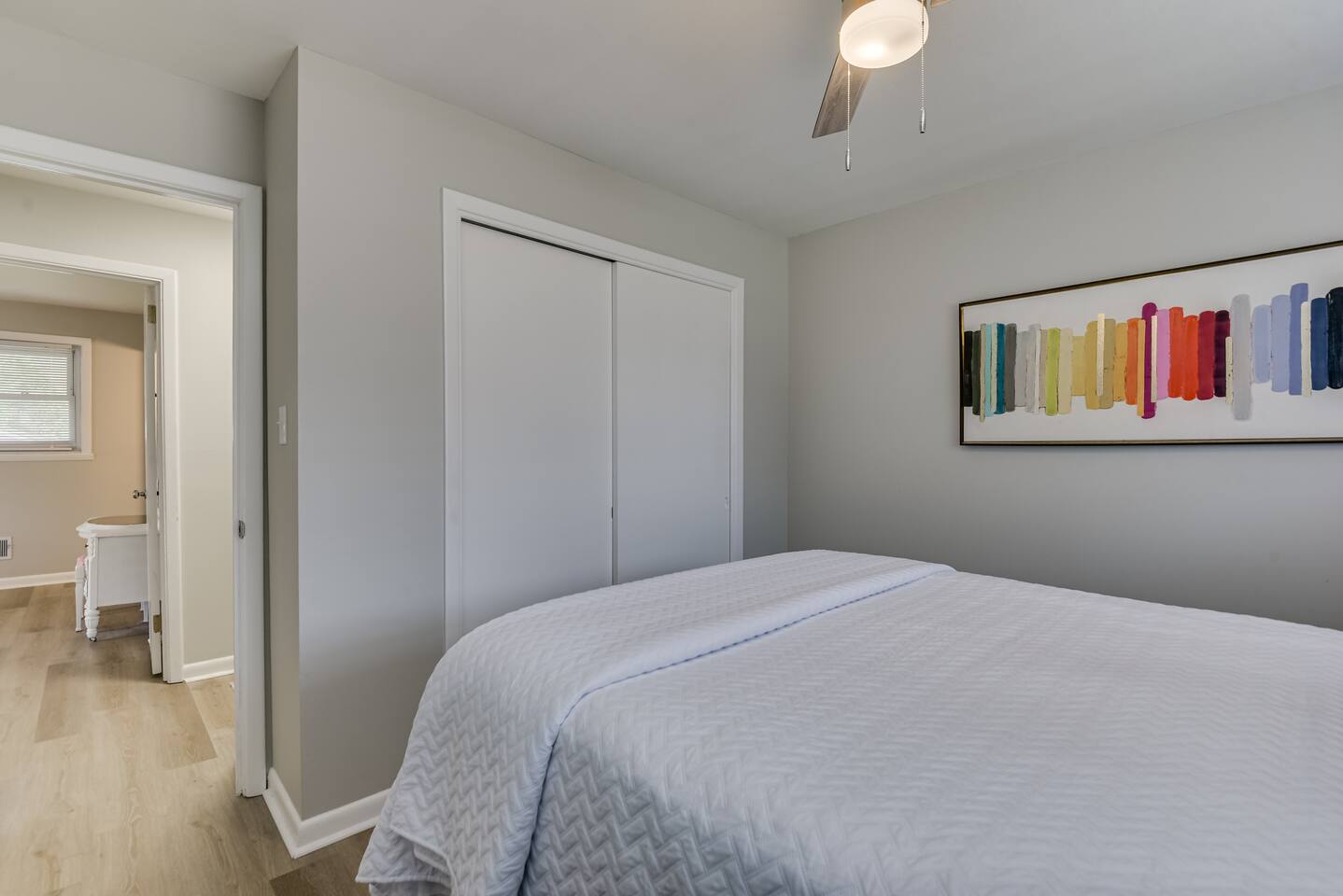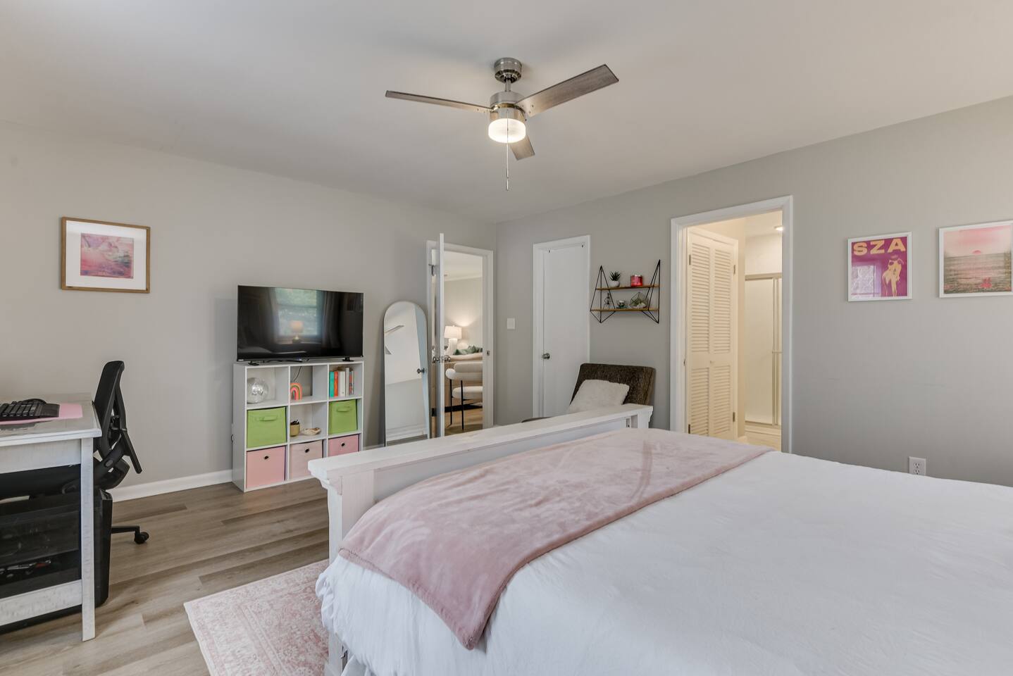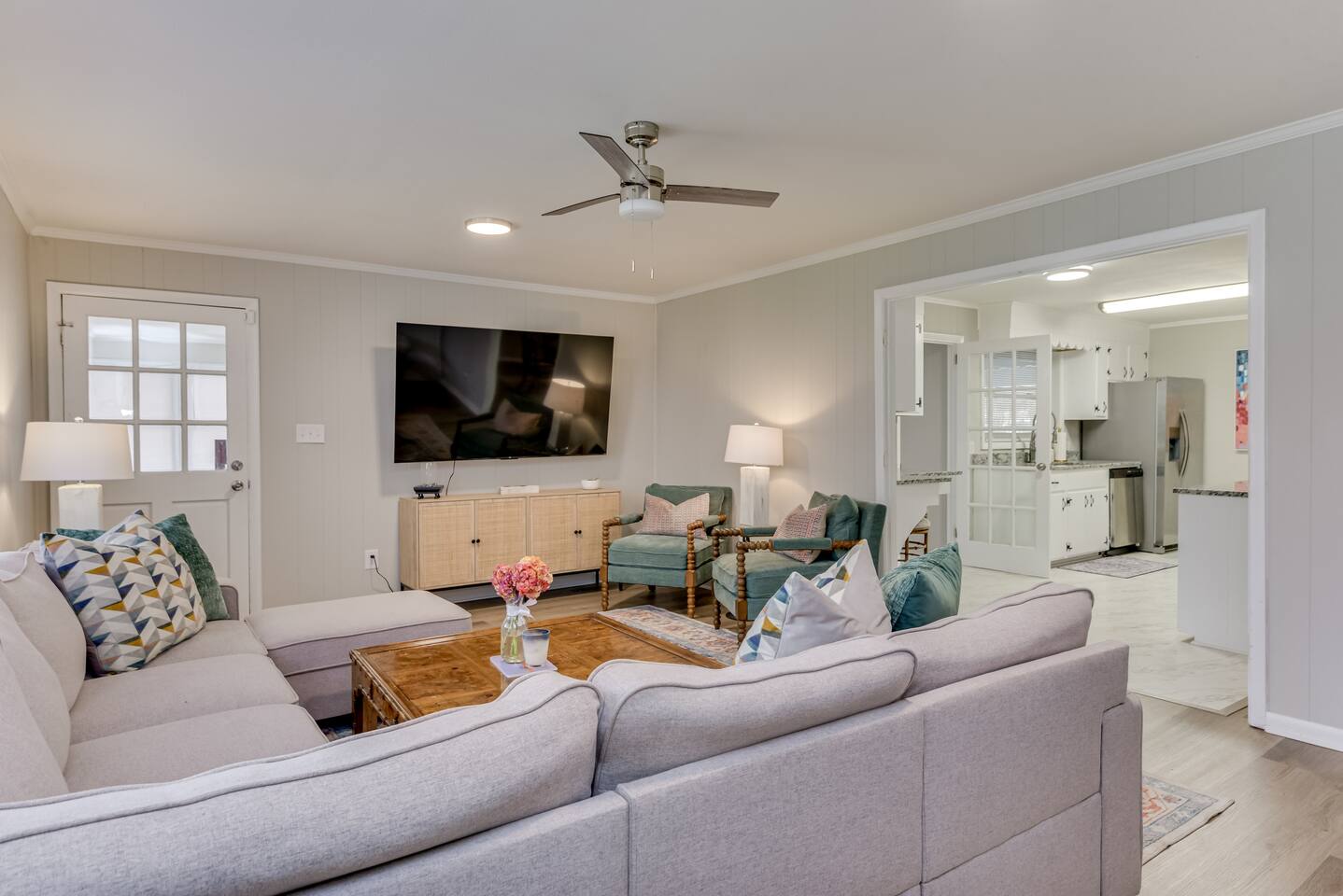 Inside: 🏠 -Bedroom 1: Queen bed w/ ensuite full bathroom 1 -Bedroom 2: Queen bed w/ ensuite full bathroom 2 -Bedroom 3: Queen bed w/ ensuite full bathroom 3 -Bedroom 4: Queen bed w/ ensuite full bathroom 4 -Bedroom 5: Queen bed -Bedroom 6: Full Bed -Full bathroom 5: Located in hall near bedrooms -Living room: Sofa, Loveseat, coffee table, TV -Kitchen: Electric stove/oven, fridge/freezer, microwave, coffee pot -Dining room: Table seats 6 -Laundry: Full size washer and dryer Outside: 🌳 -Private backyard -Free parking in the driveway Things you'll love ❤️ -Space set up perfectly for up to 12 guests -Stylish design throughout the home -Walking distance to the world famous Augusta National Golf Course! 15 min/0.7 miles