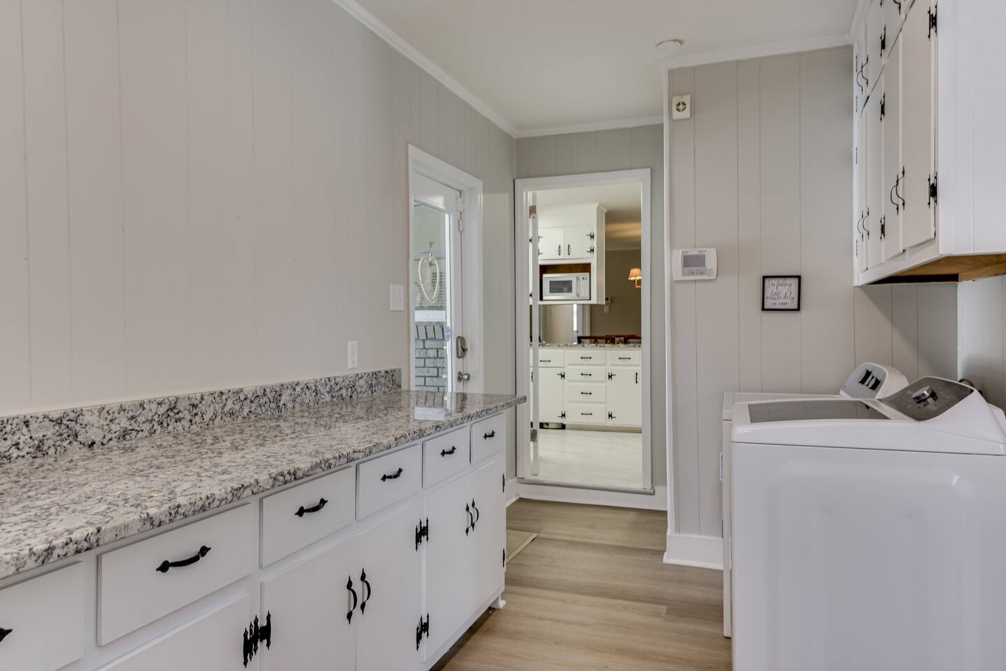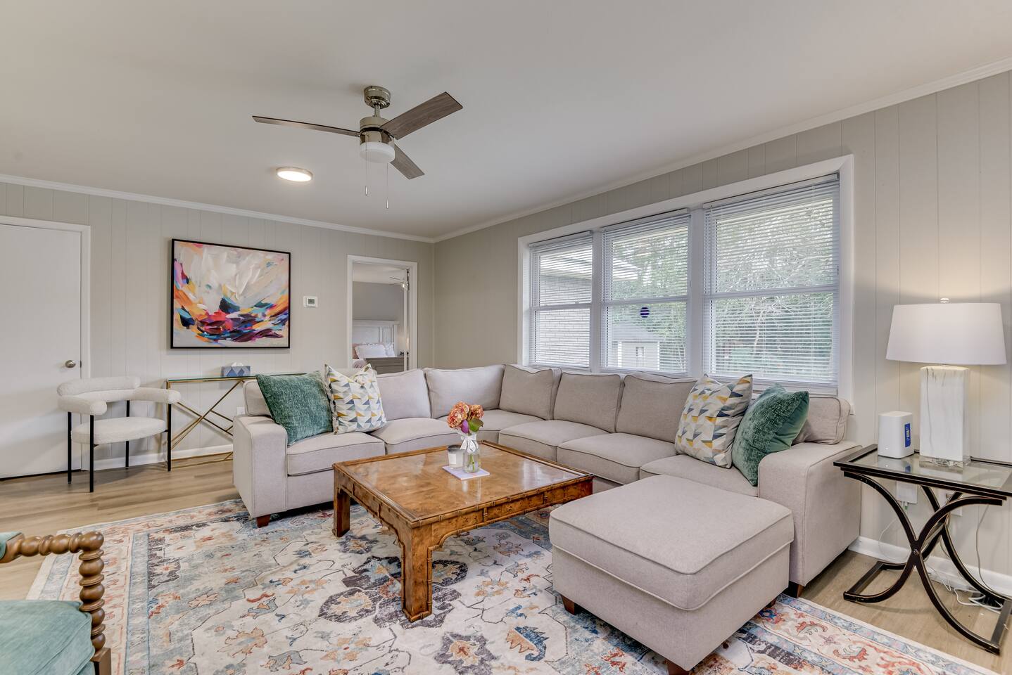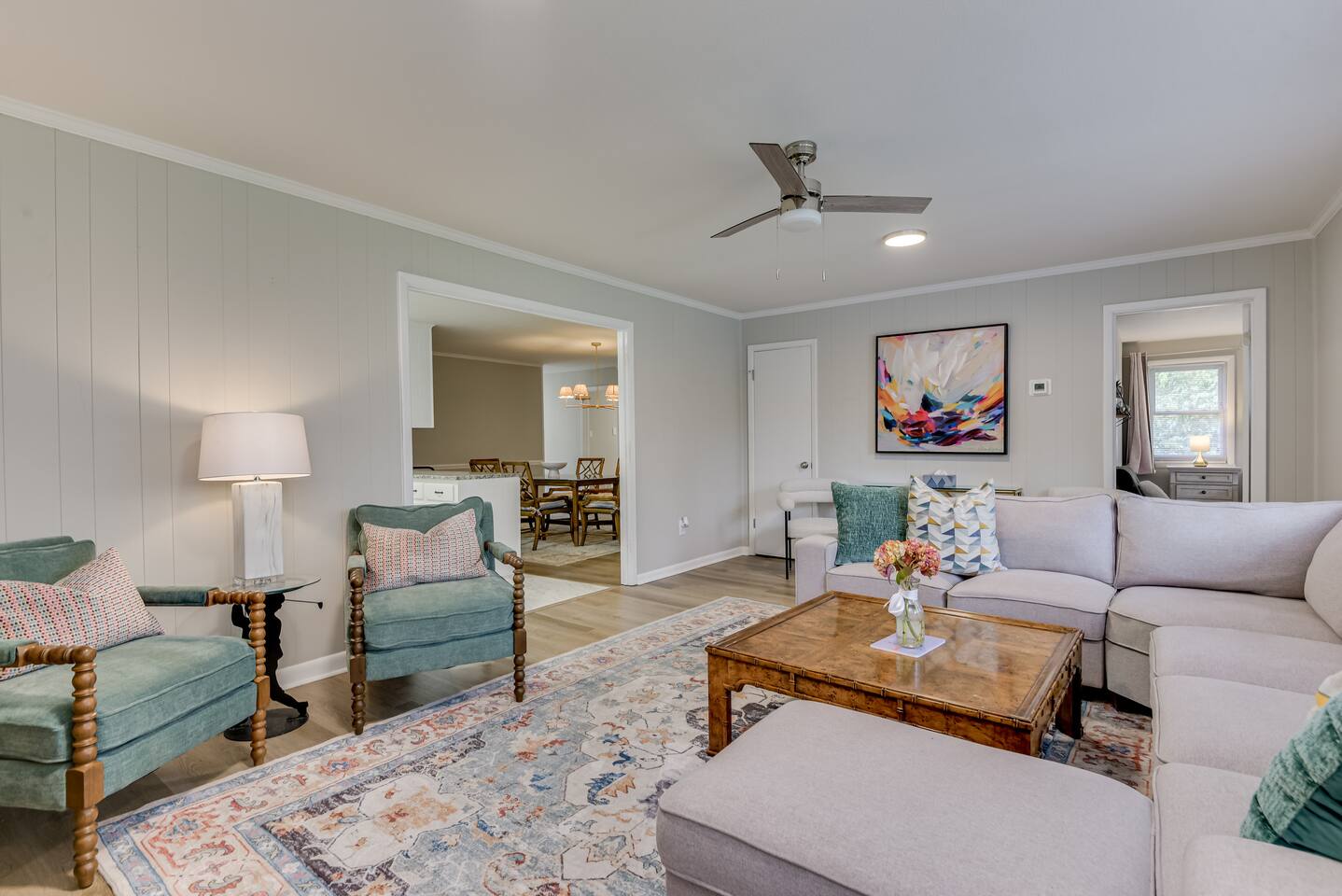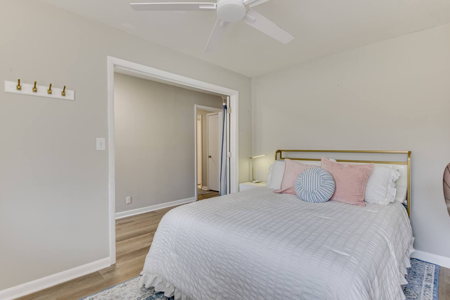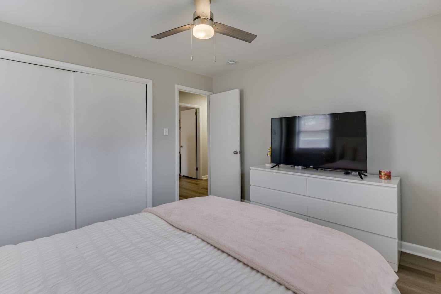 Inside: 🏠 -Bedroom 1: Queen bed w/ ensuite full bathroom 1 -Bedroom 2: Queen bed w/ ensuite full bathroom 2 -Bedroom 3: Queen bed w/ ensuite full bathroom 3 -Bedroom 4: Queen bed w/ ensuite full bathroom 4 -Bedroom 5: Queen bed -Bedroom 6: Full Bed -Full bathroom 5: Located in hall near bedrooms -Living room: Sofa, Loveseat, coffee table, TV -Kitchen: Electric stove/oven, fridge/freezer, microwave, coffee pot -Dining room: Table seats 6 -Laundry: Full size washer and dryer Outside: 🌳 -Private backyard -Free parking in the driveway Things you'll love ❤️ -Space set up perfectly for up to 12 guests -Stylish design throughout the home -Walking distance to the world famous Augusta National Golf Course! 15 min/0.7 miles