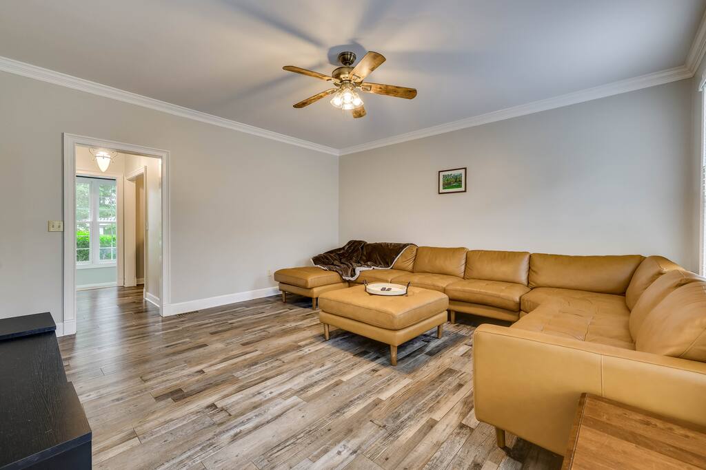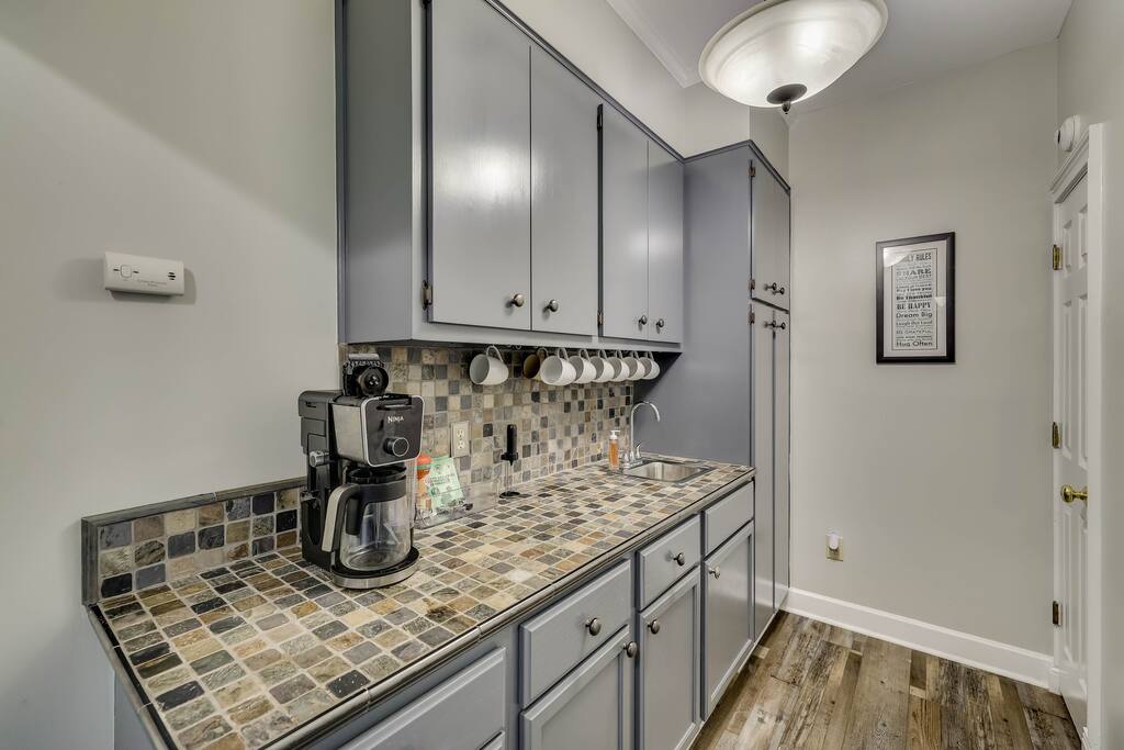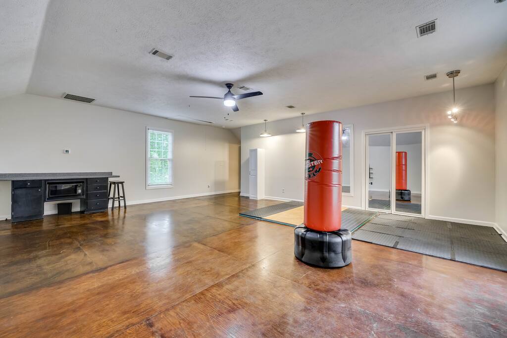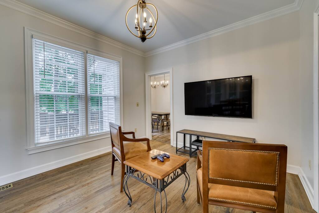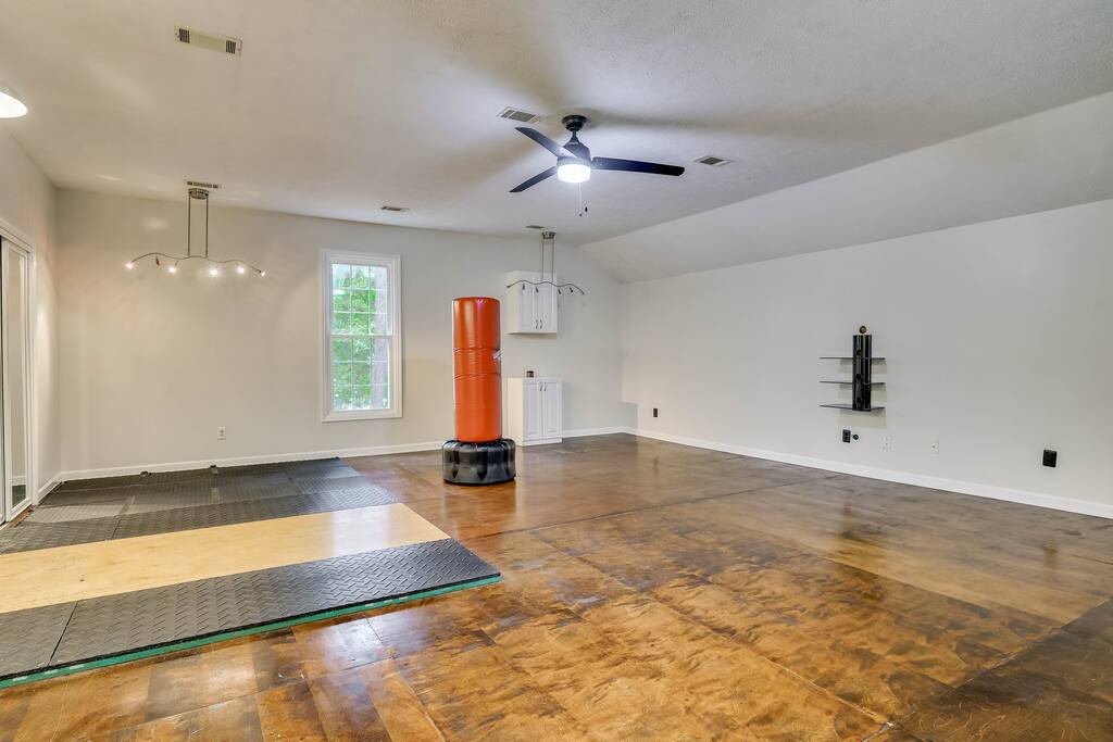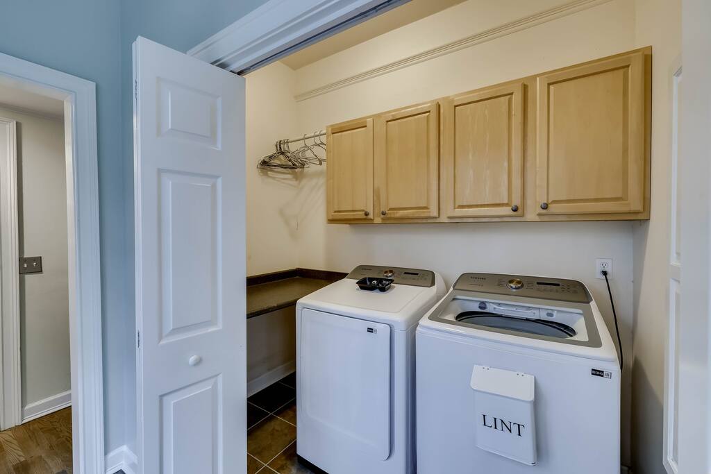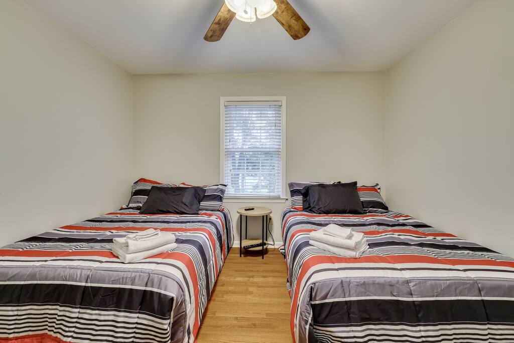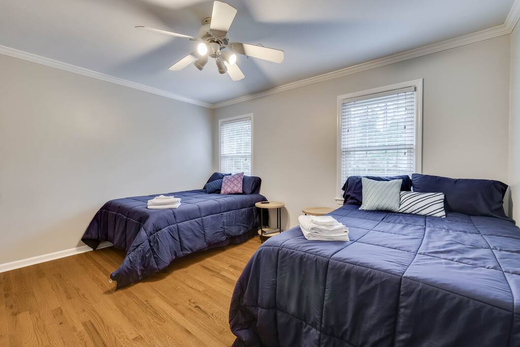 Our properties includes amenities galore! Downstairs Kitchen: Granite counter tops, stainless steal appliances, fully stocked, fridge, freezer, oven, stove, dishwasher Kitchenette: Coffee area, sink Living room 1: Giant sectional sofa set, coffee table, two side tables, flat screen TV Living room 2: Seating for 2 and flat screen TV Dining room: Dining room table seats six Library: Newly added couch, TV/Firestick, and end table. **New photos pending** Workspace: Built in desk Laundry: New washer and dryer Half bathroom Upstairs Bedroom 1: King bed, two dressers, two nightstands, ensuite bath w/walk in shower, walk in closet, TV w/Firestick Bedroom 2: Queen bed, dresser, two nightstands, closet, TV w/Firestick Bedroom 3: Two full beds, dresser, nightstand, closet, TV w/Firestick. **New photos pending** Bedroom 4: Two full beds, dresser, nightstand, closet, TV w/Firestick. **New photos pending** Hall Bath: Full bathroom with tub style shower Gym: Giant space for working out/yoga/quiet space Exterior Yard: Fenced in yard with back patio Parking: Pull through driveway fits up to 4 vehicles Garage: Please note the garage will be locked and is NOT available for guest use.