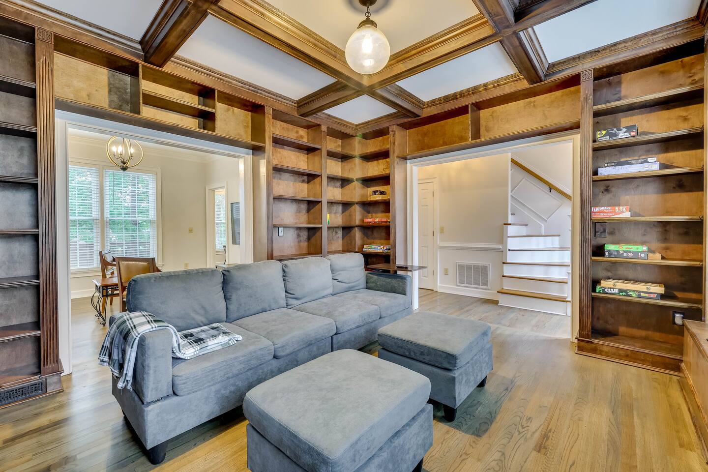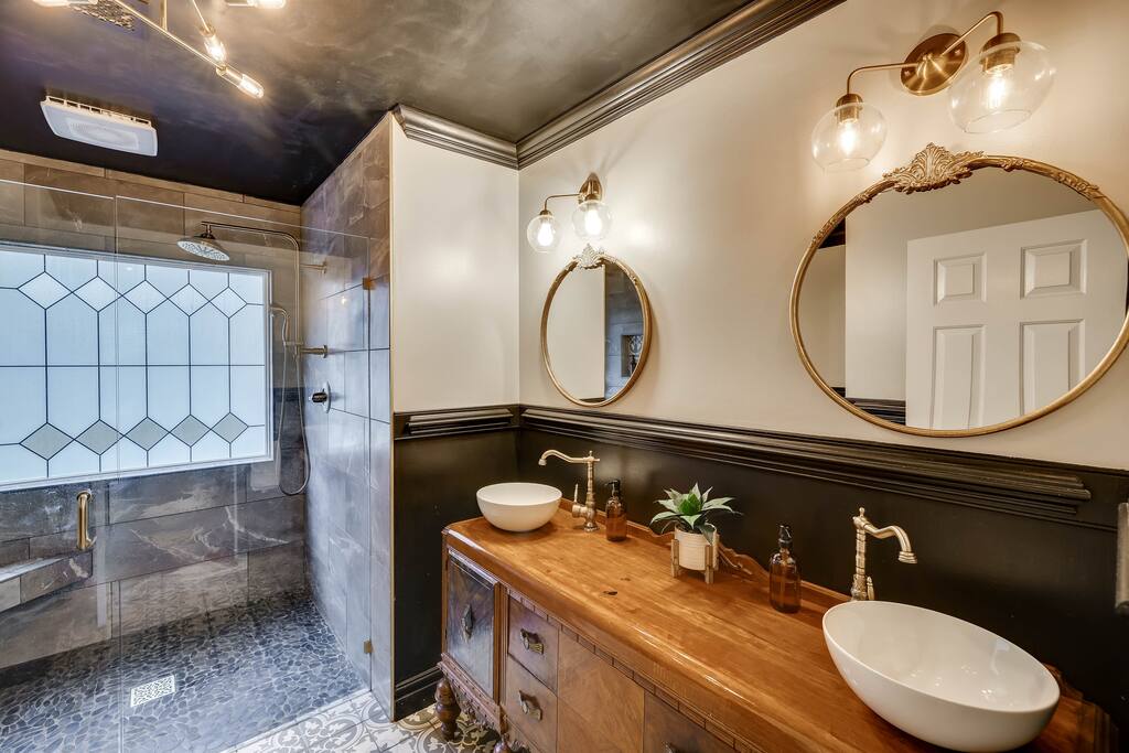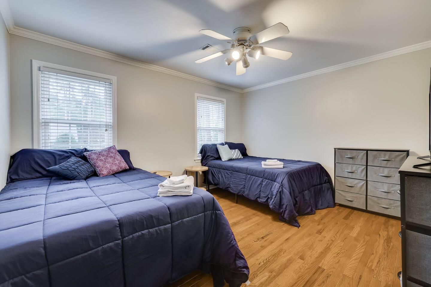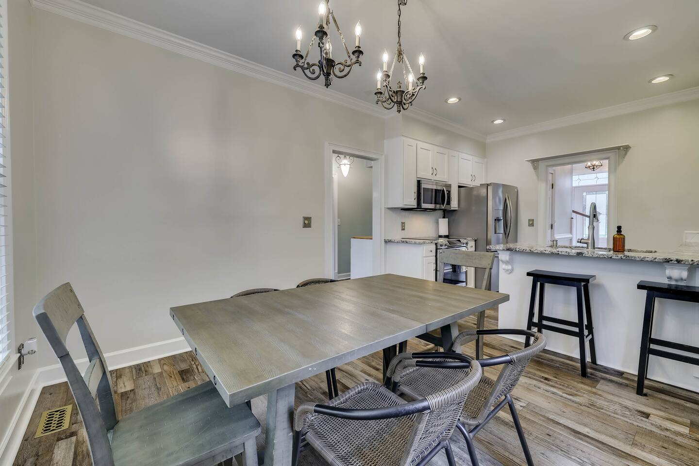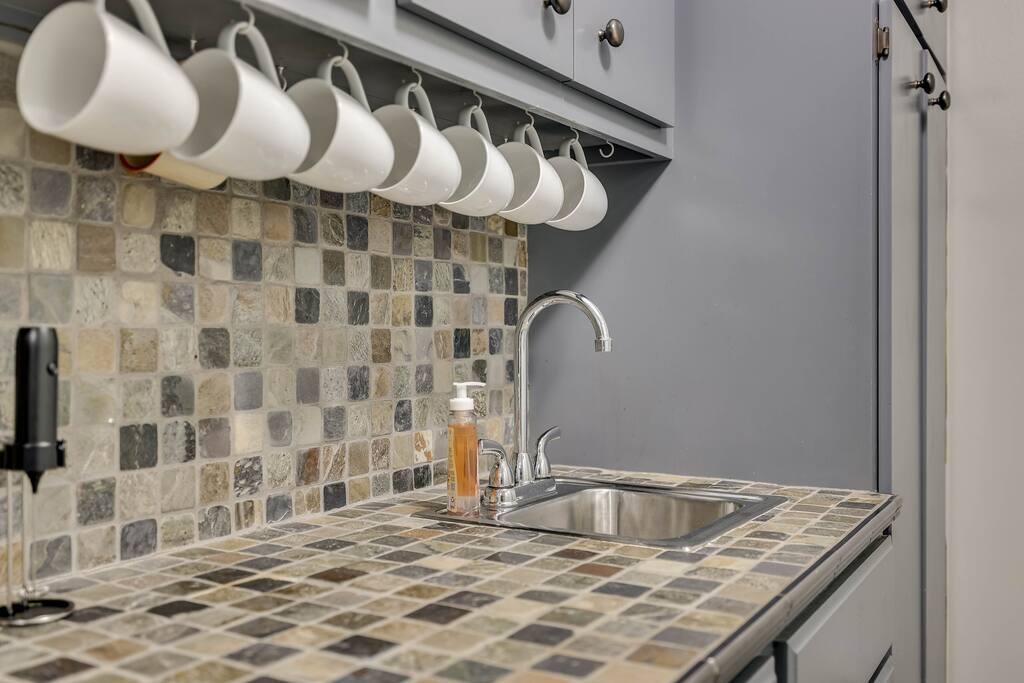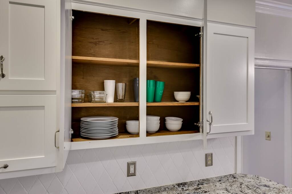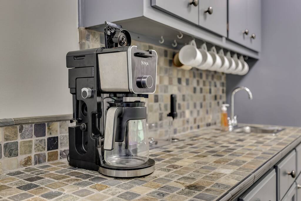 Our properties includes amenities galore! Downstairs Kitchen: Granite counter tops, stainless steal appliances, fully stocked, fridge, freezer, oven, stove, dishwasher Kitchenette: Coffee area, sink Living room 1: Giant sectional sofa set, coffee table, two side tables, flat screen TV Living room 2: Seating for 2 and flat screen TV Dining room: Dining room table seats six Library: Newly added couch, TV/Firestick, and end table. **New photos pending** Workspace: Built in desk Laundry: New washer and dryer Half bathroom Upstairs Bedroom 1: King bed, two dressers, two nightstands, ensuite bath w/walk in shower, walk in closet, TV w/Firestick Bedroom 2: Queen bed, dresser, two nightstands, closet, TV w/Firestick Bedroom 3: Two full beds, dresser, nightstand, closet, TV w/Firestick. **New photos pending** Bedroom 4: Two full beds, dresser, nightstand, closet, TV w/Firestick. **New photos pending** Hall Bath: Full bathroom with tub style shower Gym: Giant space for working out/yoga/quiet space Exterior Yard: Fenced in yard with back patio Parking: Pull through driveway fits up to 4 vehicles Garage: Please note the garage will be locked and is NOT available for guest use.