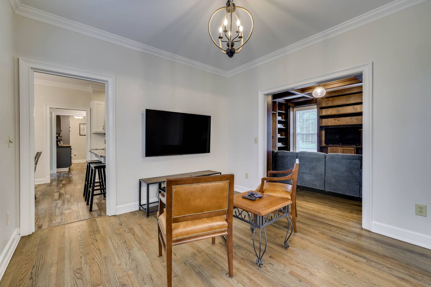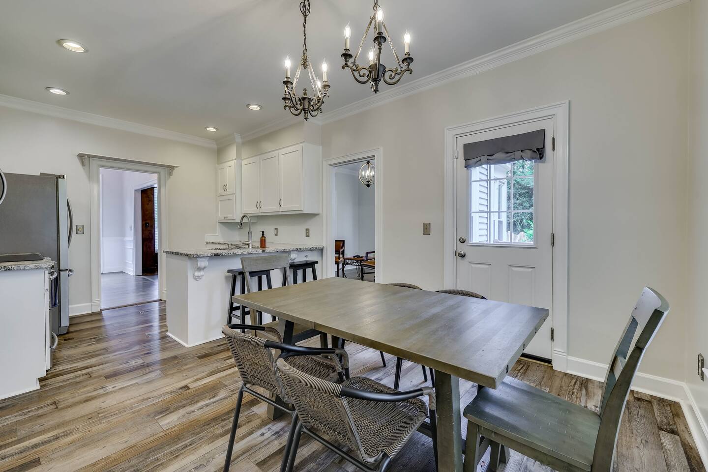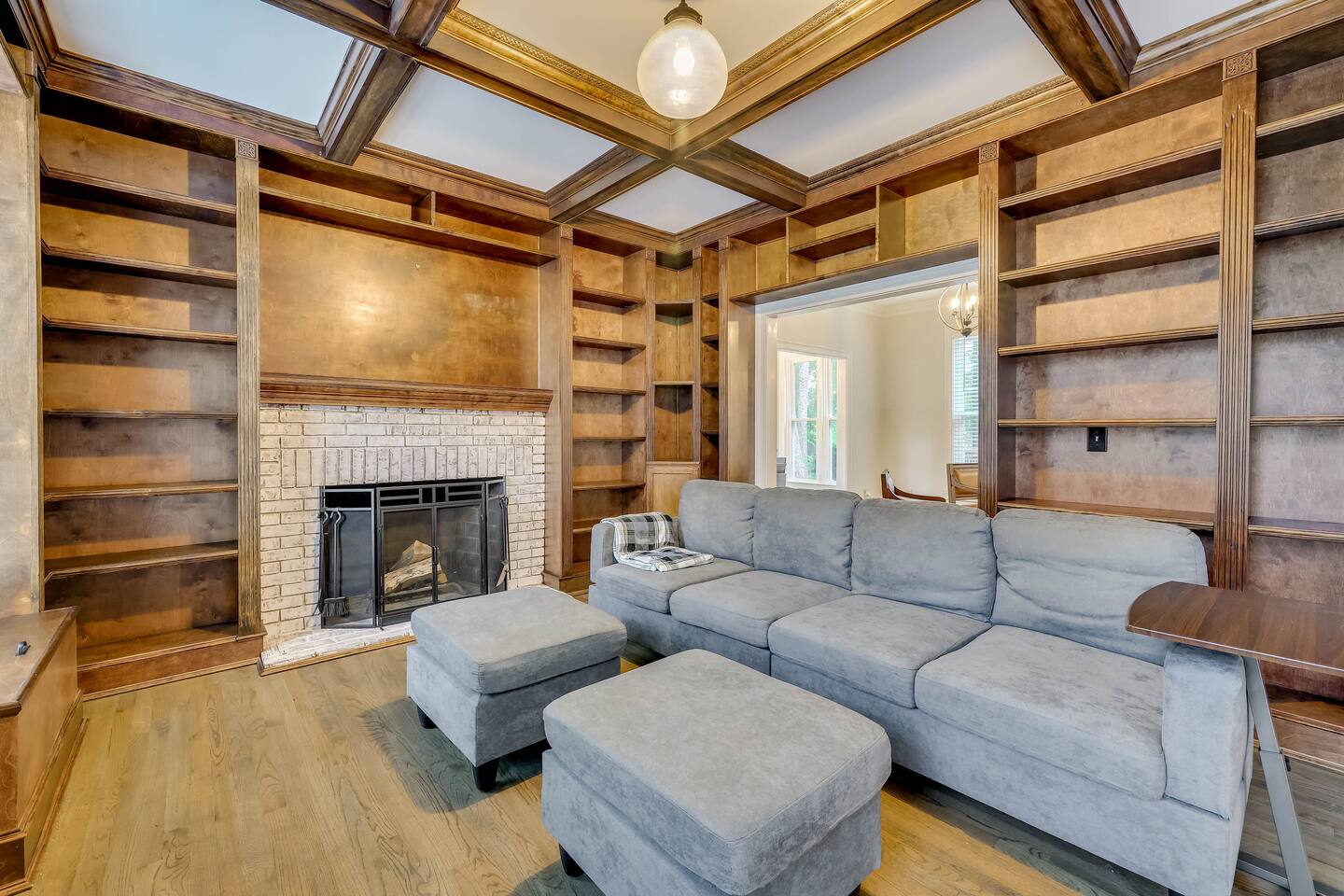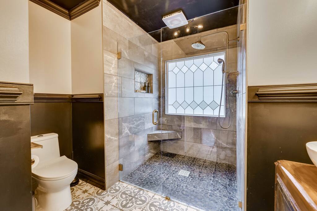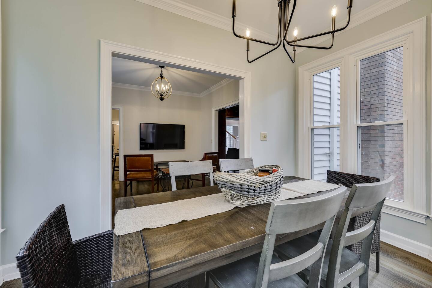 Our properties includes amenities galore! Downstairs Kitchen: Granite counter tops, stainless steal appliances, fully stocked, fridge, freezer, oven, stove, dishwasher Kitchenette: Coffee area, sink Living room 1: Giant sectional sofa set, coffee table, two side tables, flat screen TV Living room 2: Seating for 2 and flat screen TV Dining room: Dining room table seats six Library: Newly added couch, TV/Firestick, and end table. **New photos pending** Workspace: Built in desk Laundry: New washer and dryer Half bathroom Upstairs Bedroom 1: King bed, two dressers, two nightstands, ensuite bath w/walk in shower, walk in closet, TV w/Firestick Bedroom 2: Queen bed, dresser, two nightstands, closet, TV w/Firestick Bedroom 3: Two full beds, dresser, nightstand, closet, TV w/Firestick. **New photos pending** Bedroom 4: Two full beds, dresser, nightstand, closet, TV w/Firestick. **New photos pending** Hall Bath: Full bathroom with tub style shower Gym: Giant space for working out/yoga/quiet space Exterior Yard: Fenced in yard with back patio Parking: Pull through driveway fits up to 4 vehicles Garage: Please note the garage will be locked and is NOT available for guest use.