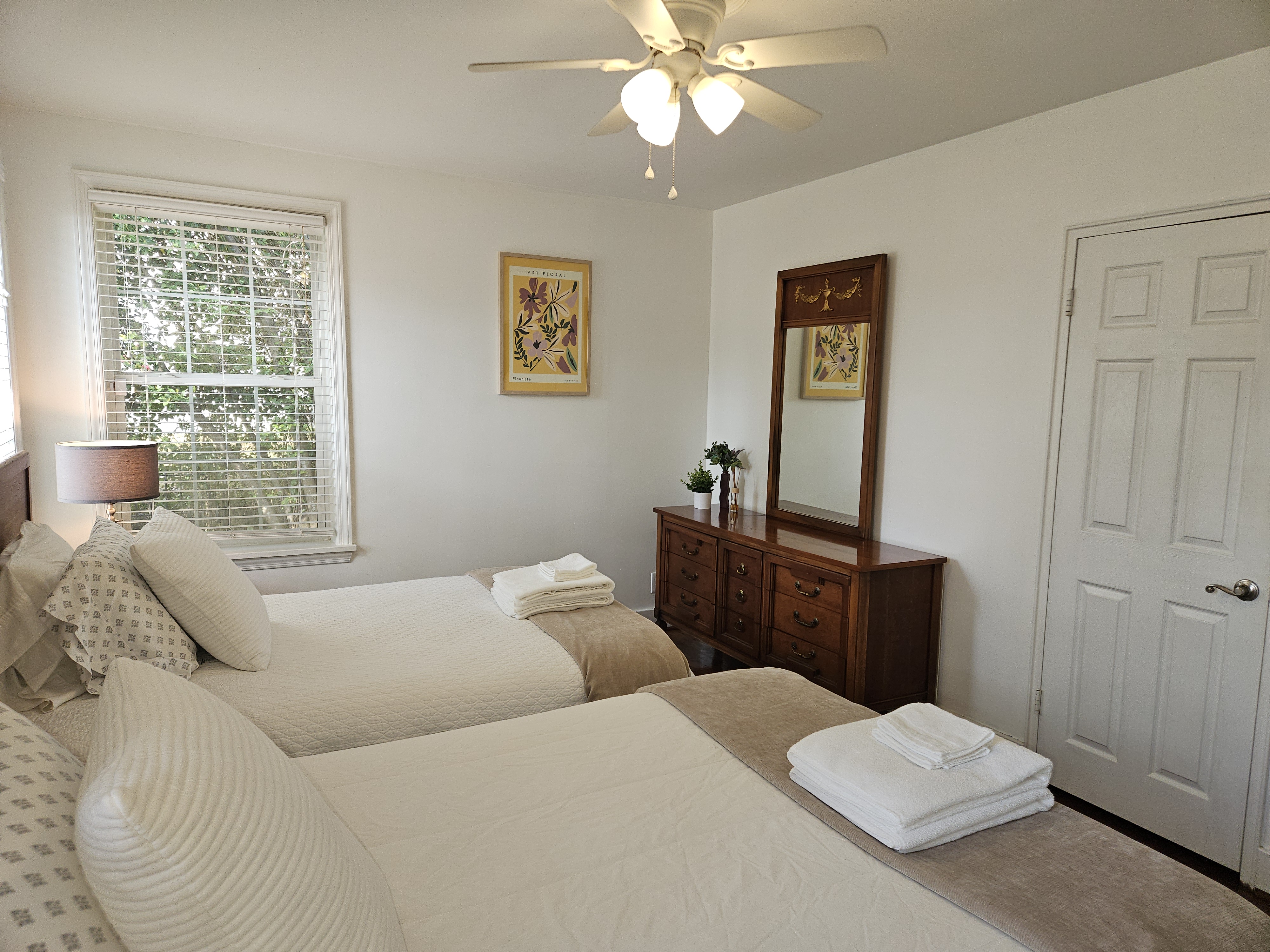 Inside: 🏠 Bedroom 1: Queen mattress, dresser, nightstands, ensuite bathroom Bedroom 2: Queen mattress, dresser, nightstand Bedroom 3: Two Full mattresses, dresser, night stands Living room: Sectional, Large screen TV, desk, chair Dining room: Large table seats 8 Kitchen: Fully stocked, Island seats 2, view into sunroom Sunroom: Washer and Dryer, Chaise lounge, Table seats 4, TV Outside: 🌳 Covered parking: 2 carports in rear of property fits 2-3 vehicles Peaceful surroundings with mature plants and fruit trees! Things you'll love: ❤️ Lots of cool plants on the property including fig, plum, and mulberry trees! Walking distance to the Augusta National Golf Course. Home of the Word Famous Masters Tournament! ⛳